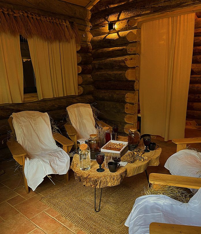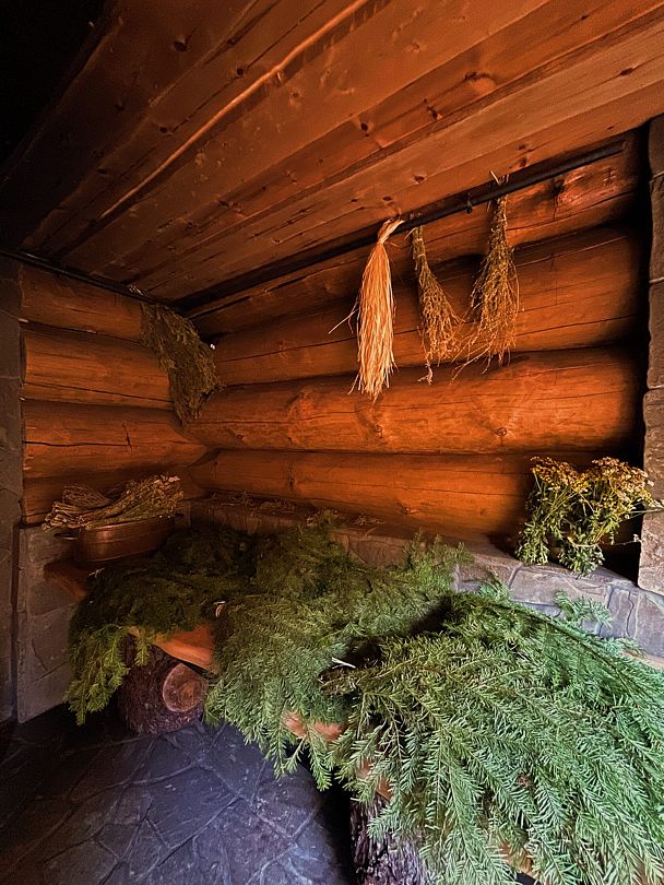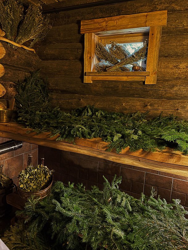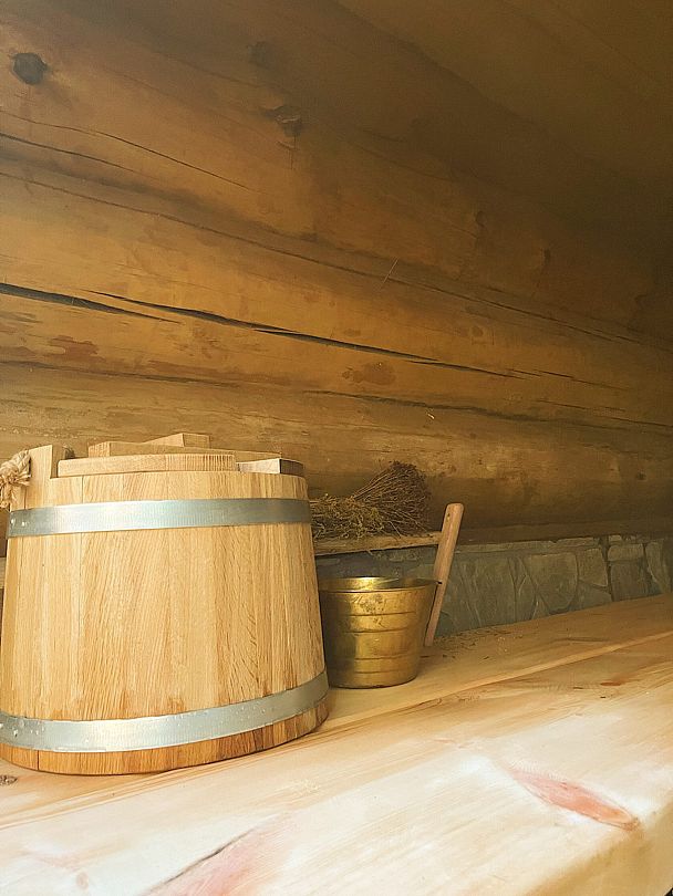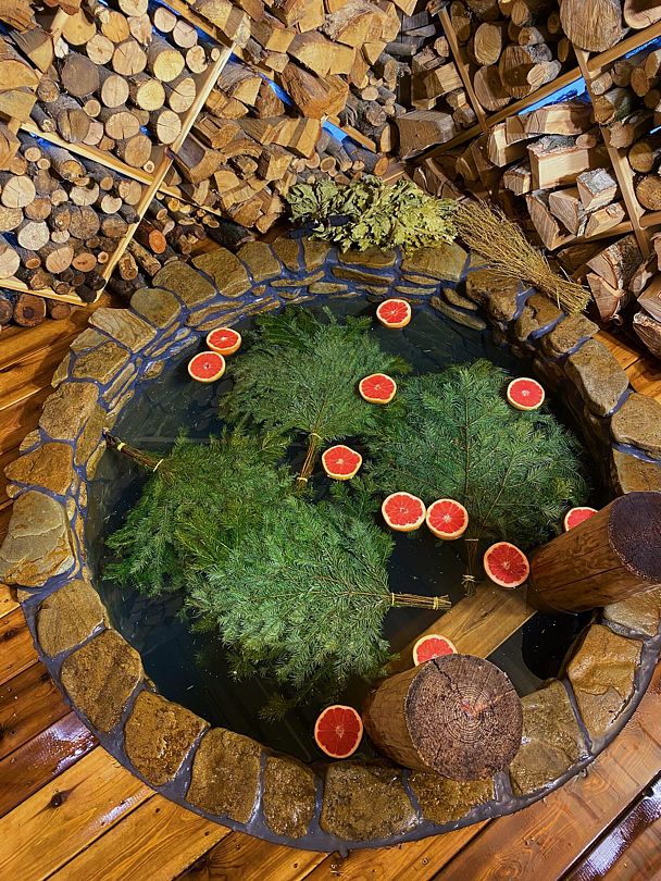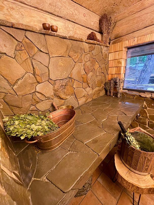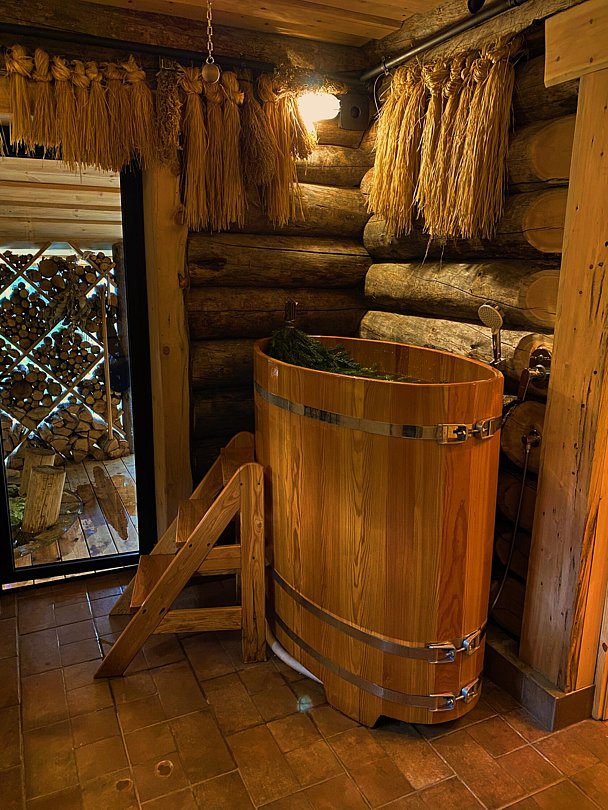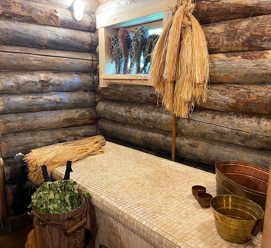Инфраструктура: купель, чан, зона отдыха, душ, дубовые веники, березовые веникиВнутри бани расположены помывочная с подогреваемым массажным столом, тёплой купелью с отварами трав, комната отдыха с сеновалом, уборная.На уличной территории расположен чан на огне, лежачие качели укрытые сеном, уличный сеновал укрытый от осадков, холодная купель.