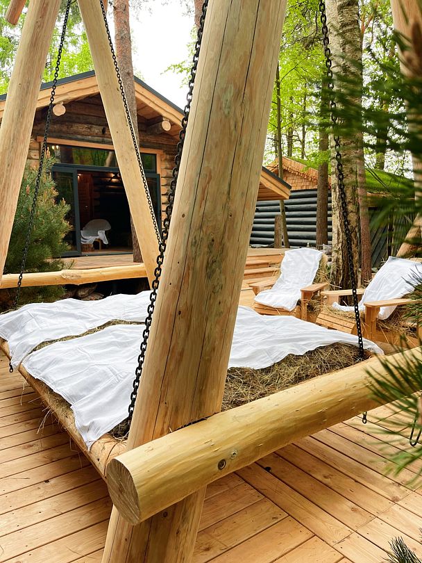 На уличной территории расположен чан на огне, лежачие качели укрытые сеном, уличный сеновал укрытый от осадков, холодная купель.