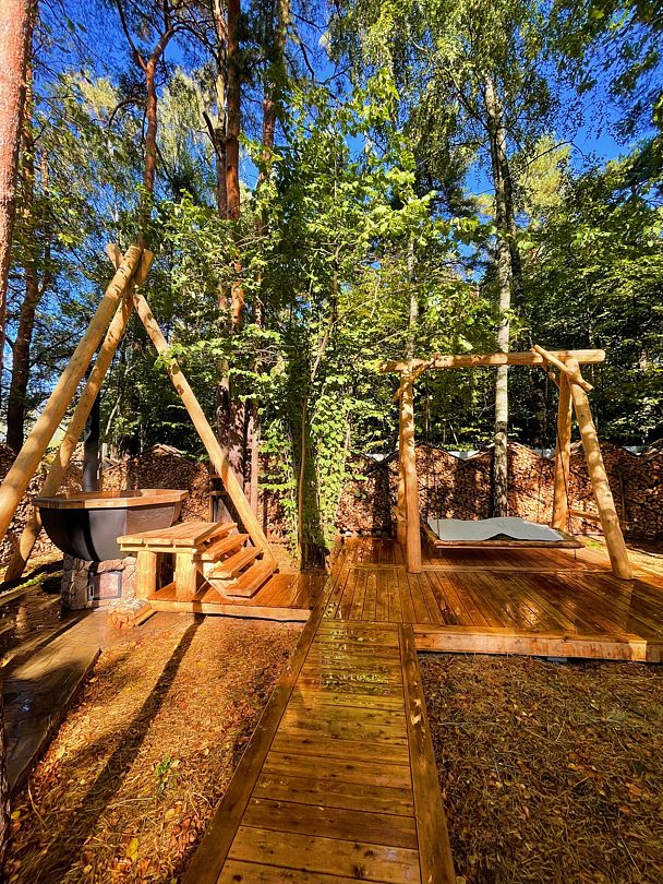 Инфраструктура: купель, чан, зона отдыха, душКело – это сухостойная сосна возрастом до 300 лет, которая засохла на корню в условиях северных карельских широт.