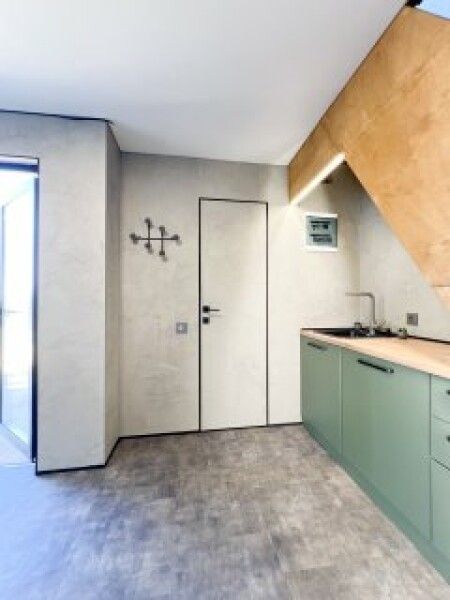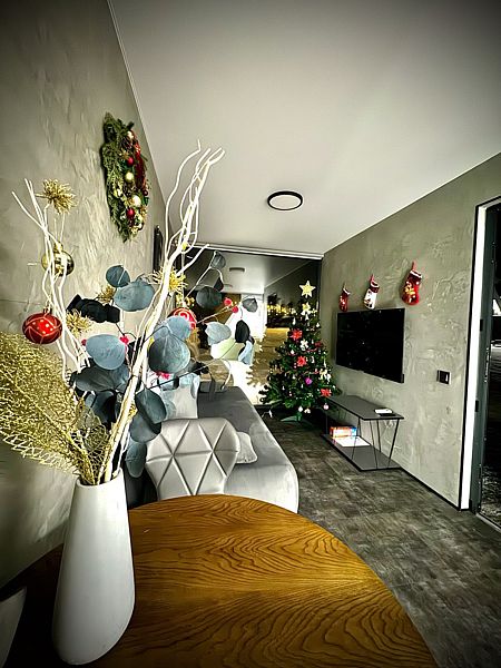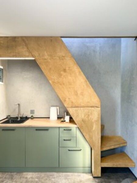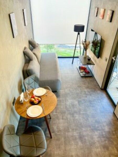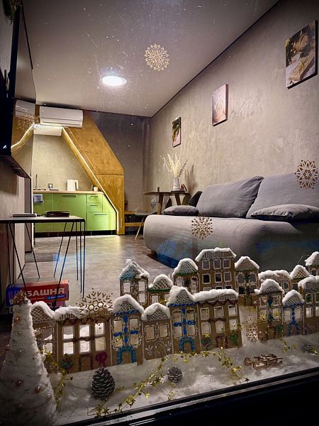 Первый этаж полностью оборудованная мини кухня с посудой и приборами для приготовления и приёма пищи, индукционная плита, мини-бар (оплачивается отдельно), набор для приготовления чая и кофе. Вместительный стол с удобными стульями, за которым может расположиться вся семья.