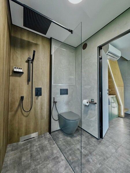 Ванная комната оборудована душевой кабиной с тропическим душем, большой удобной раковиной и унитазом инсталляцией с гигиеническим душем.