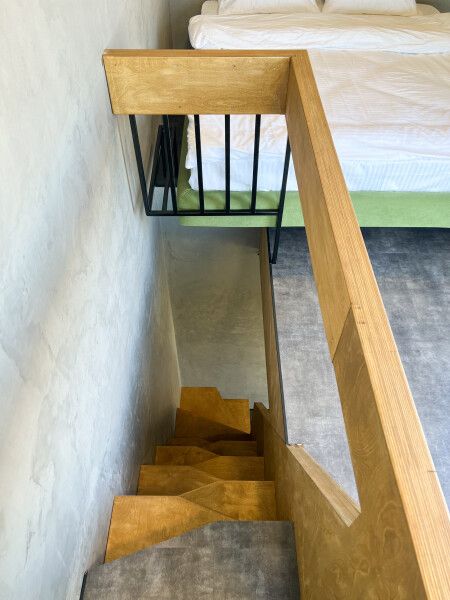 Второй этаж оснащен двуспальной парящей кроватью с ортопедическим матрасом средней жесткости, размером 160*200см., рейлингом для одежды, уютным креслом, пуфом и журнальным столиком.