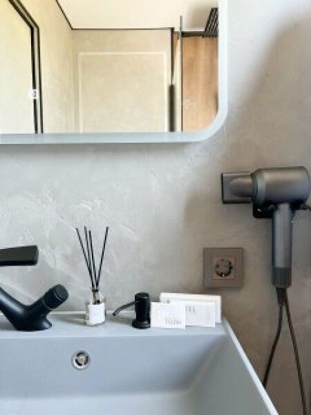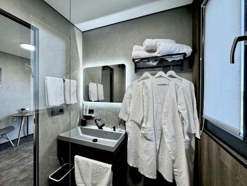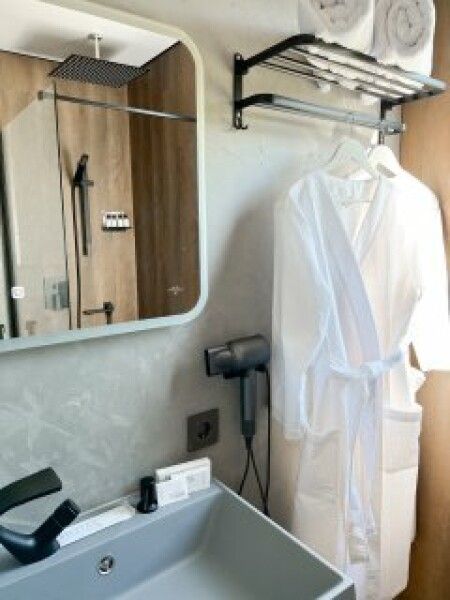 Здесь позаботились и о таких полезных мелочах, как косметические принадлежности (шампунь, кондиционер для волос, гель, лосьон для тела, зубной набор, бритвенный набор (предоставляется по запросу), швейный набор, мочалка для душа, расческа), фен для волос, два полотенца для каждого гостя, тапочки и халаты.