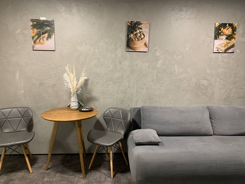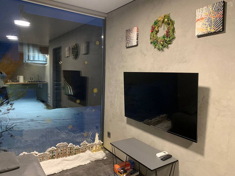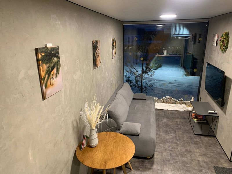 Зона отдыха оснащена мягким диваном (дополнительное спальное место) и телевизором 50 дюймов под управлением «Алисы».