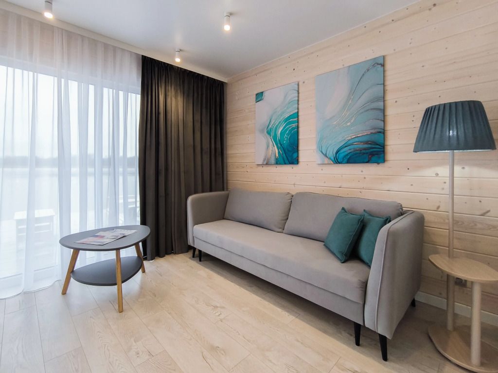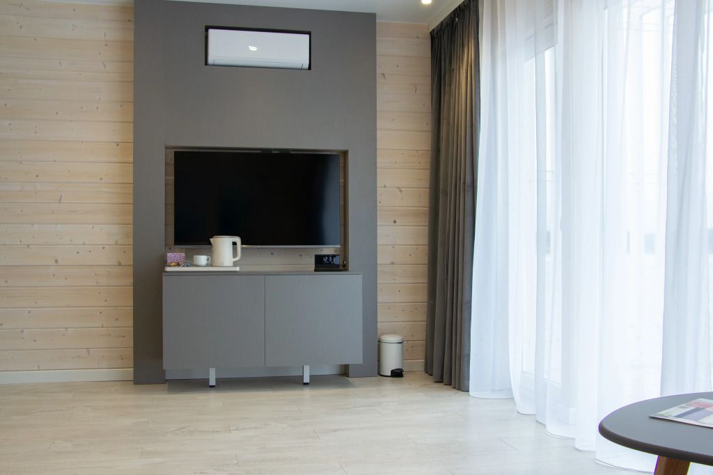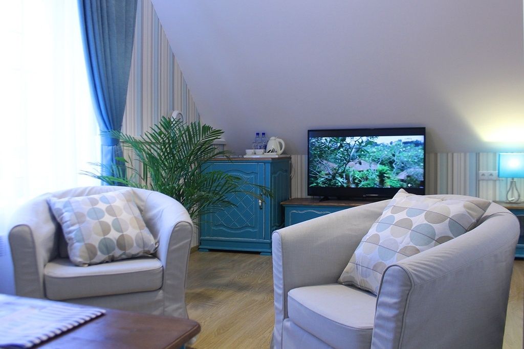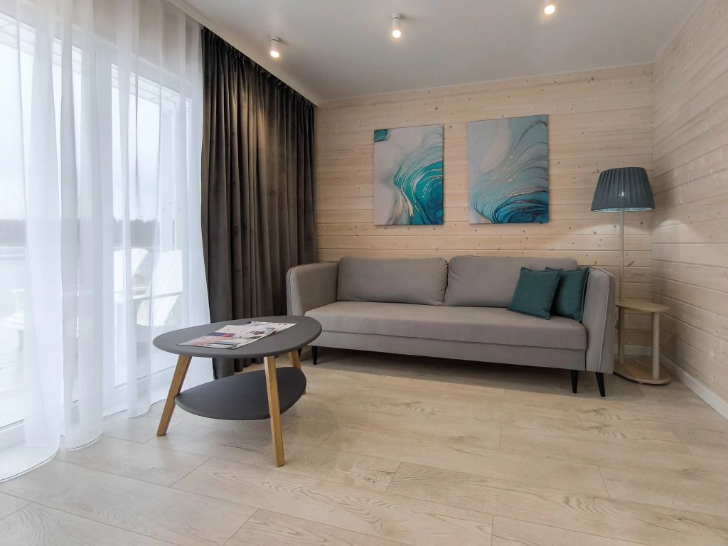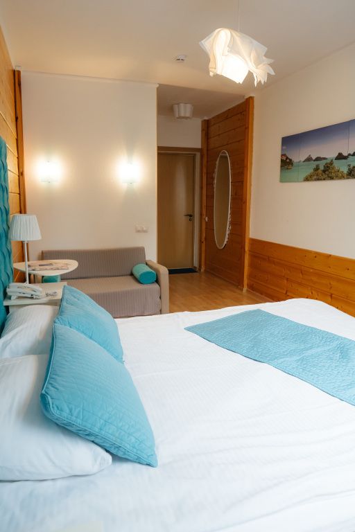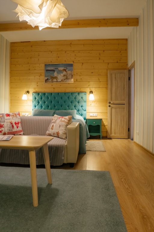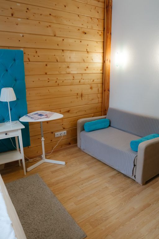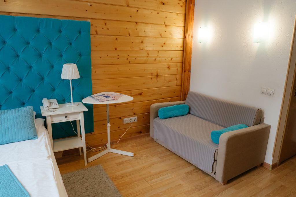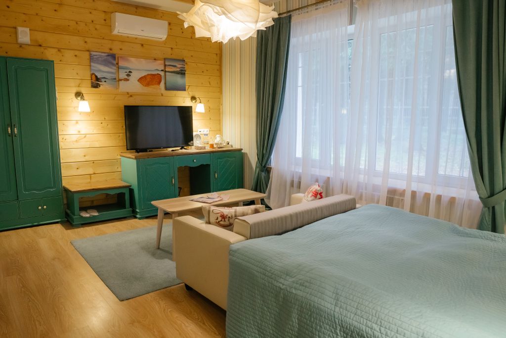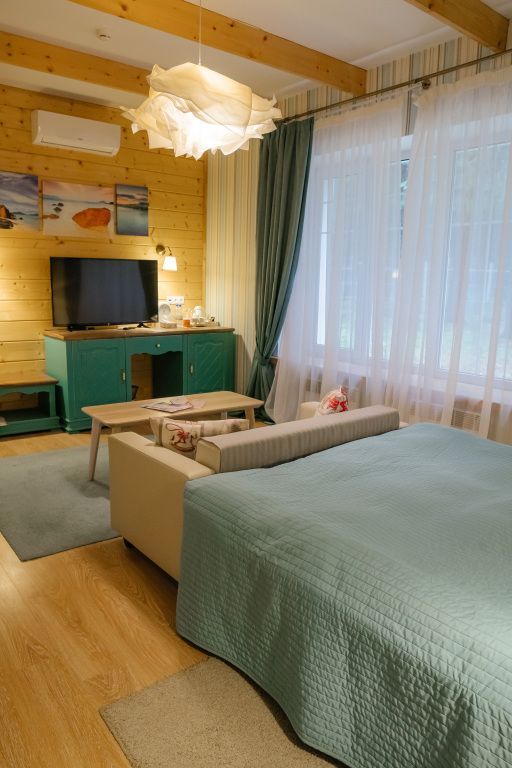 В гостиной: диван, который можно разложить при размещение более двух гостей ( за дополнительную оплату), журнальный столик, шкаф для одежды, мини-холодильник, система автоматического кондиционирования и отопления. Номер подходит для размещения гостей, которые путешествуют с детьми.
