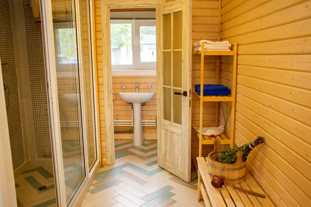 Инфраструктура: тапочки, зона отдыха, полотенца, шапочки, обливное ведро, душ, дубовые веники, березовые веникиК вашим услугам: душевая с ушатом, парная, комната отдыха со спутниковым ТВ, веранда с прилегающей зоной барбекю, фетровая шапка, полотенце.