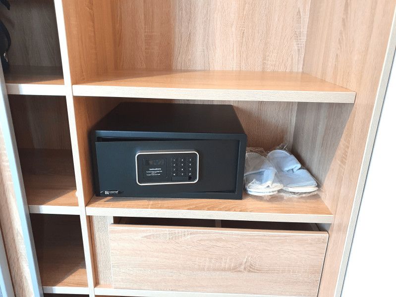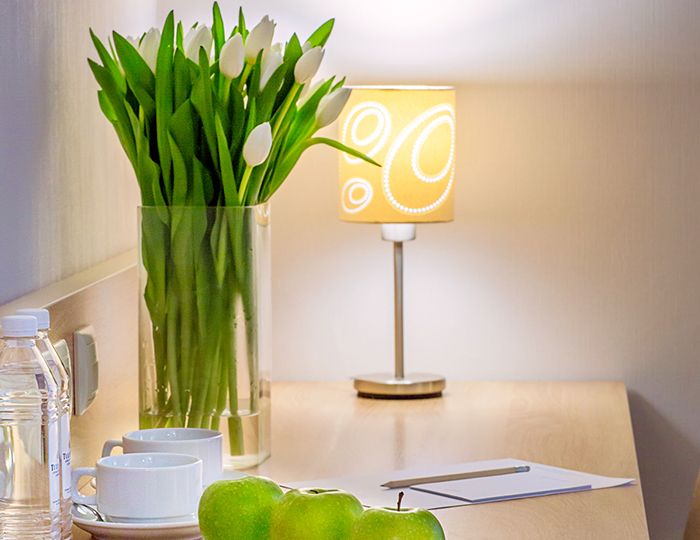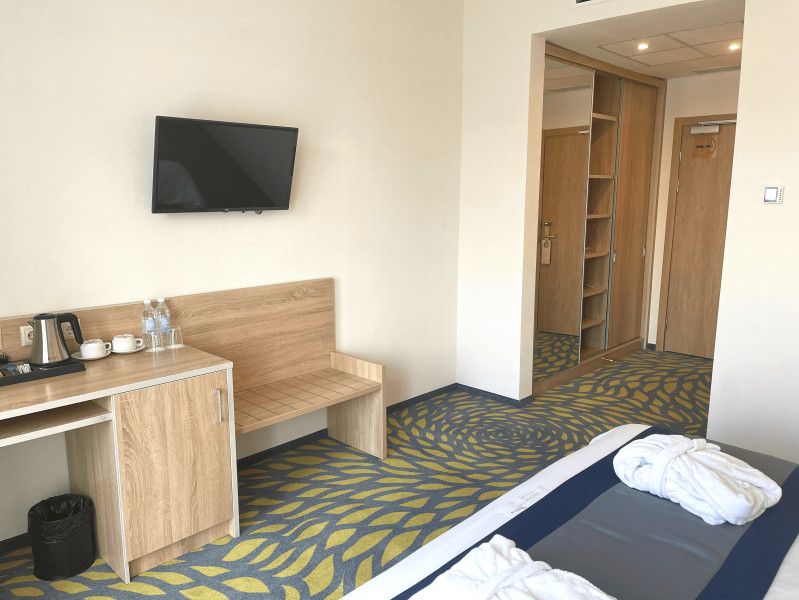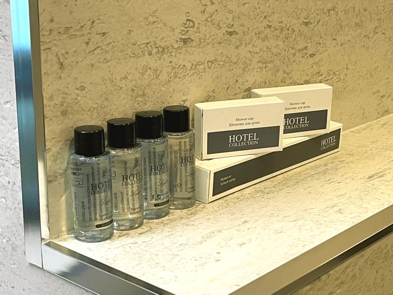 Номер укомплектован плазменной панелью, рабочим местом, телефоном, кондиционером, сейфом, чайником и мини-холодильником. В номер при заезде предоставляются тапочки и бутилированная вода.