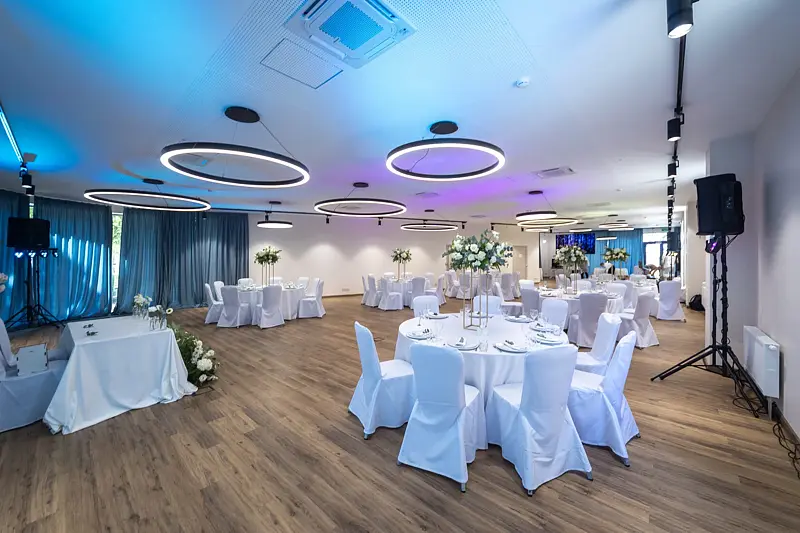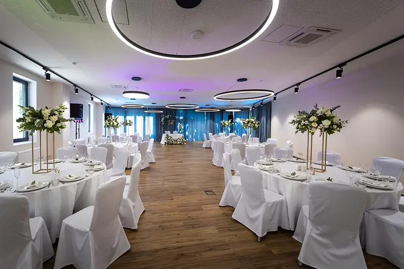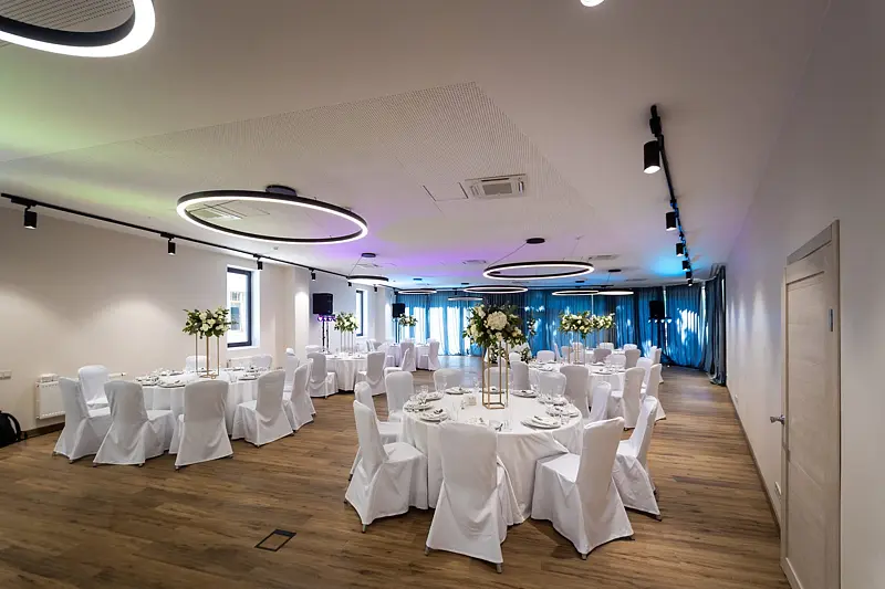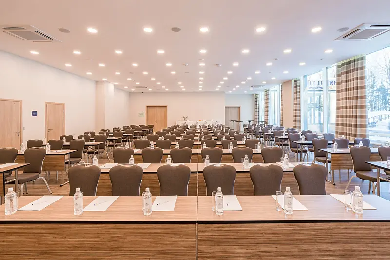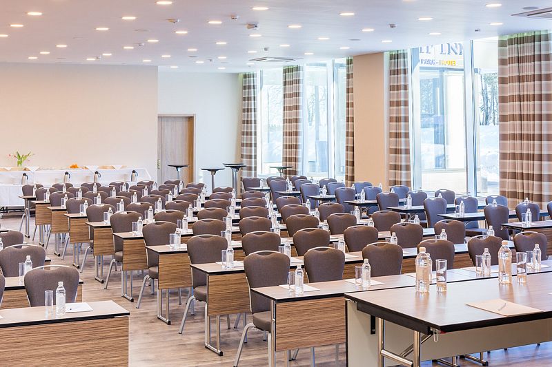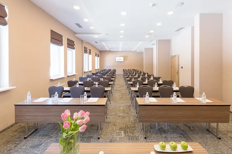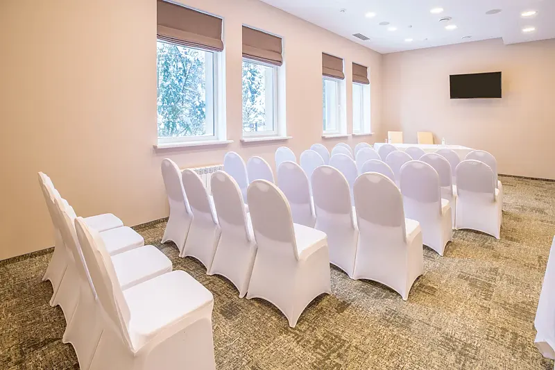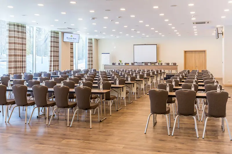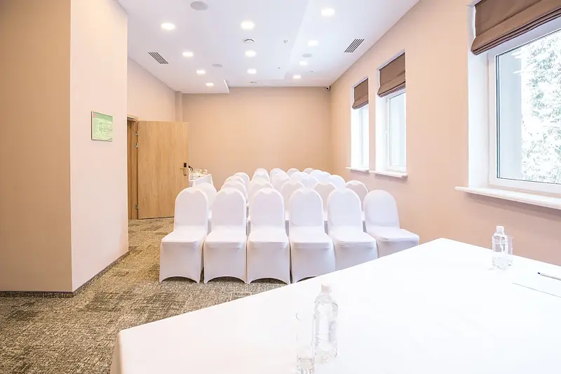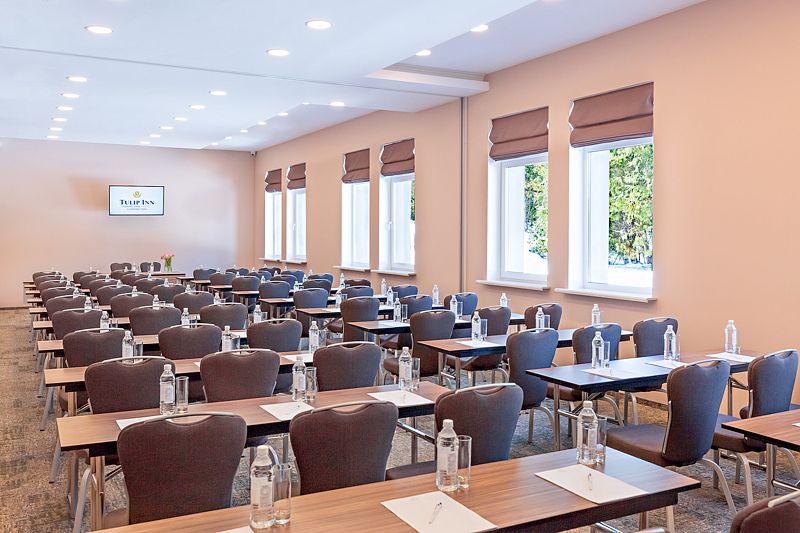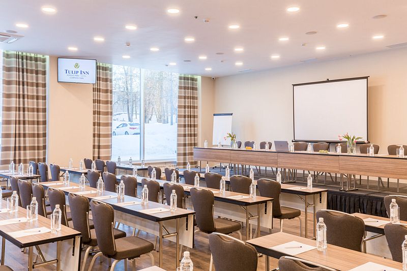 Благодаря мобильной перегородке, большой зал может быть разделен на две уютные переговорные.