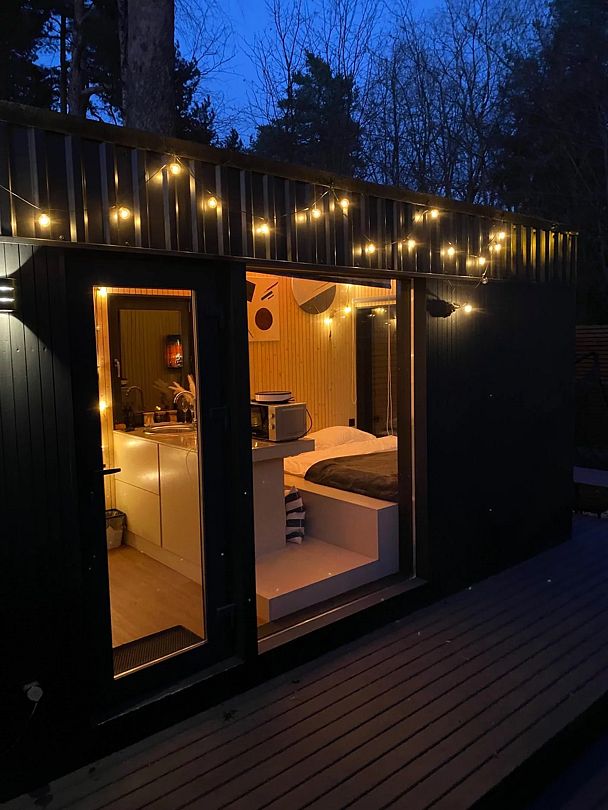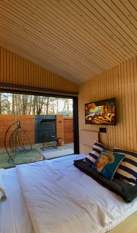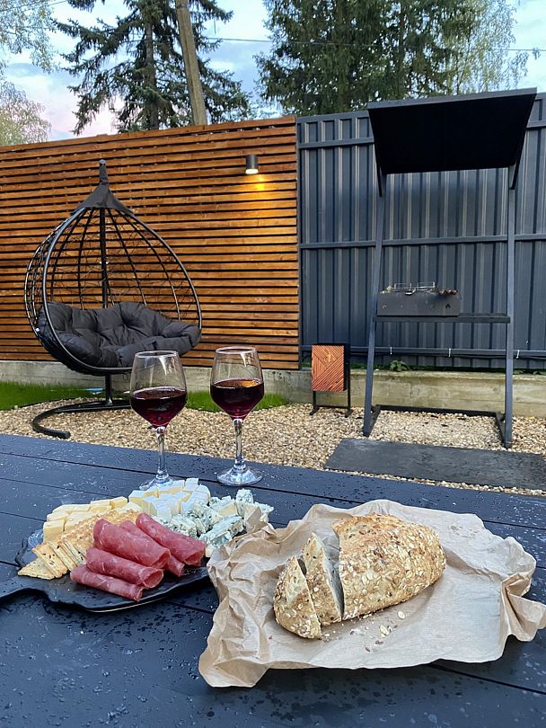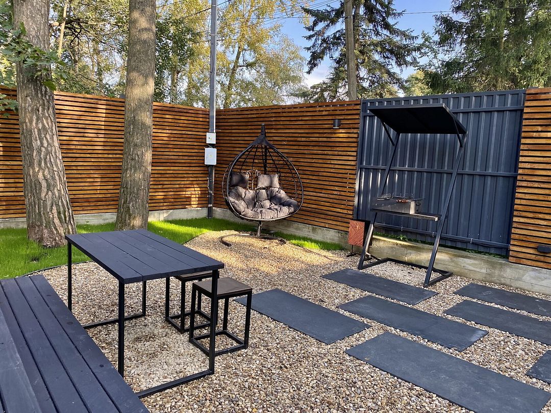 «Ультрасовременный домик для двоих с мангалом и купелью» расположен всего в 10 минутах от метро «Немчиновка». Вас ждет уникальный скандинавский дизайн, полностью оборудованная гостевая кухня, несколько систем отопления и очистка воздуха, финская сауна, терраса с коконом-качелью и купелью, а также уютная территория с деревьями и мангальной зоной.