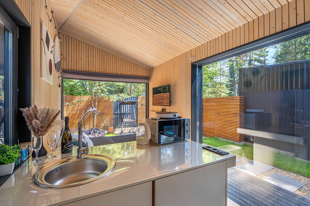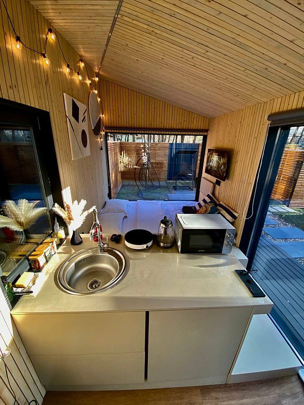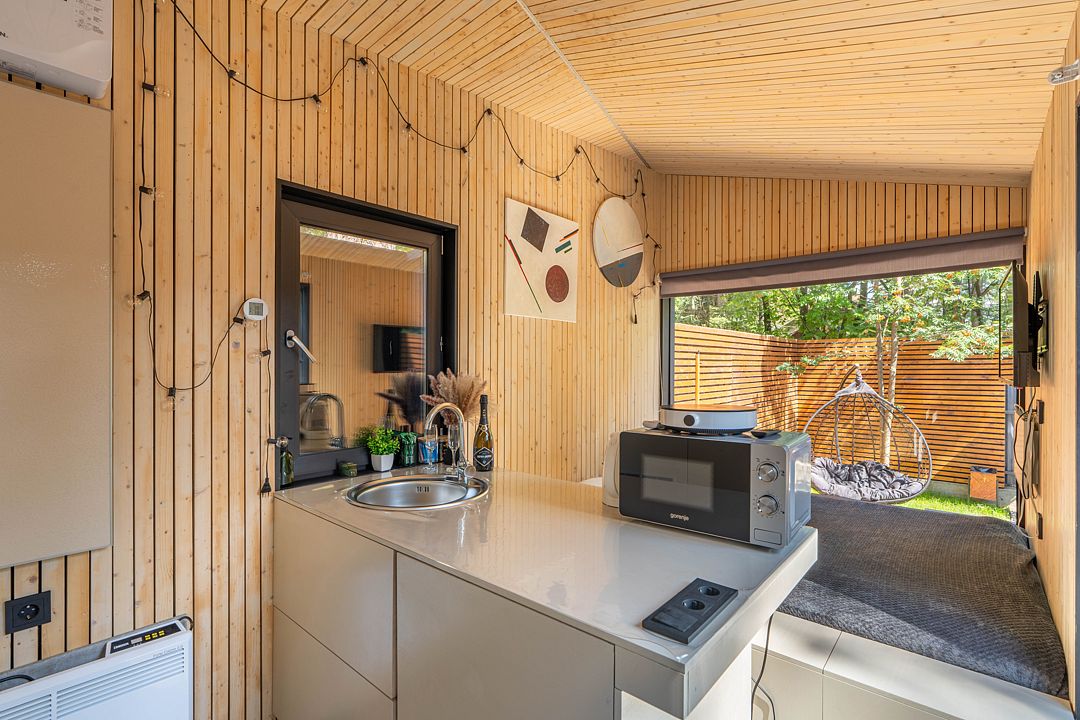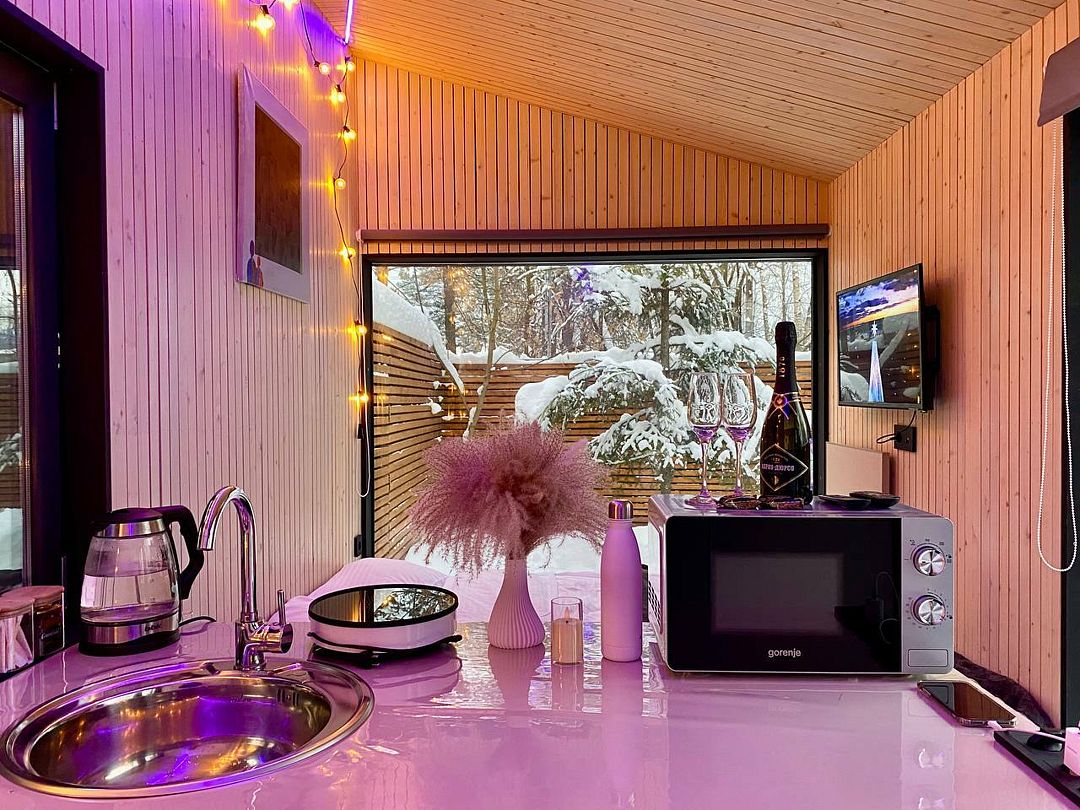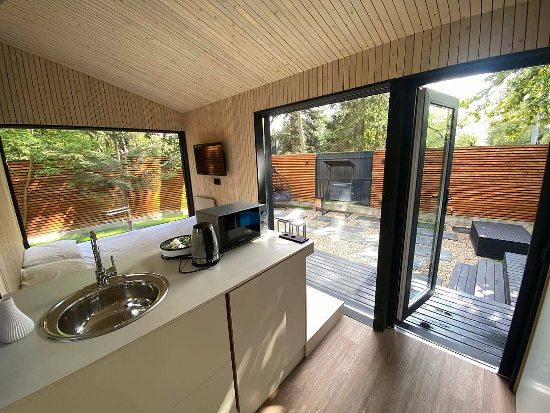 В домике полностью оборудована гостевая кухня (холодильник, микроволновка, плита, чайник и т. д).