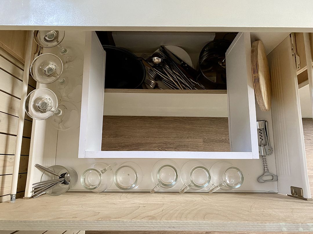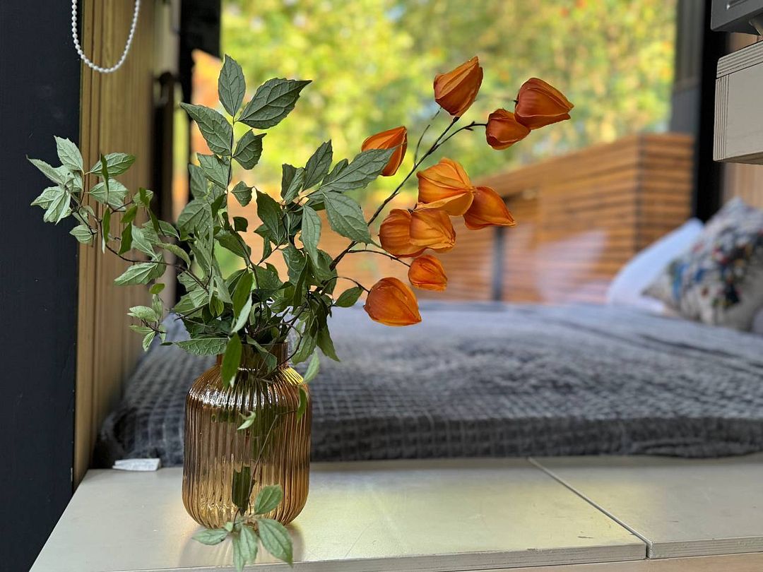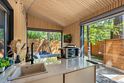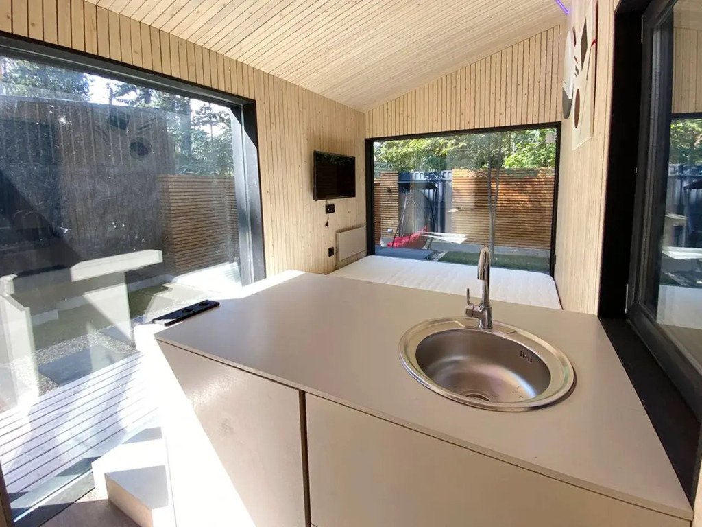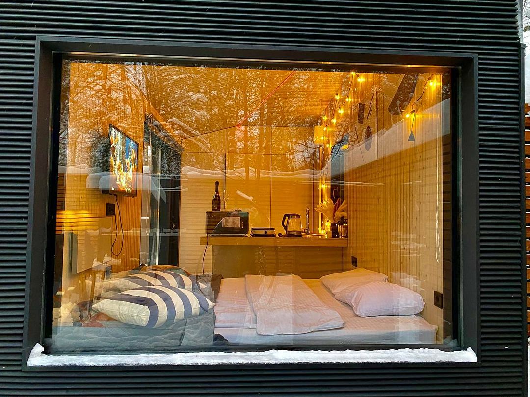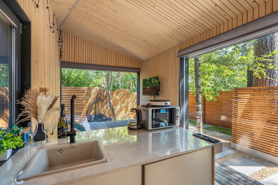 В домике полностью оборудована гостевая кухня (холодильник, микроволновка, плита, чайник и т. д).