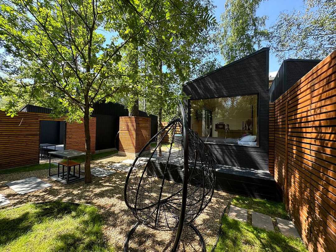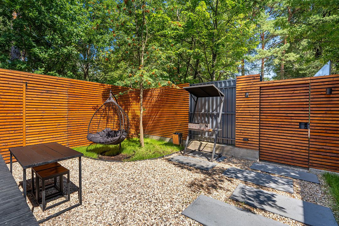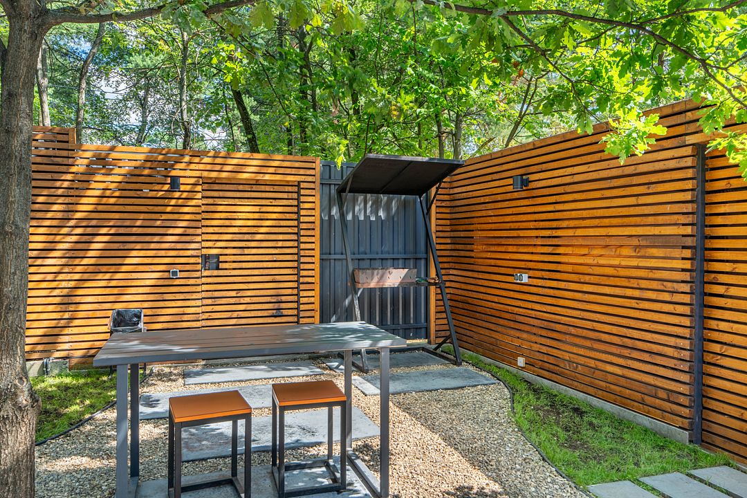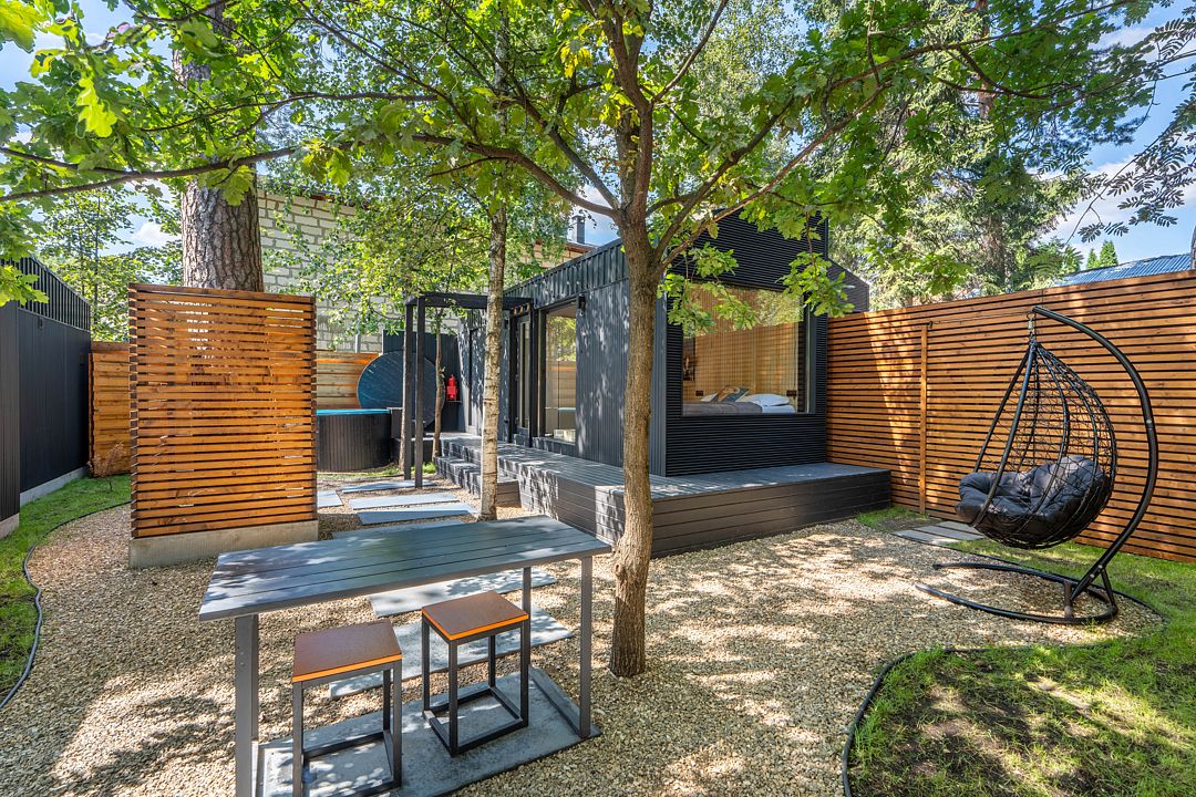 На уютной территории есть деревья, лавочки, подвесные коконы, мангал и купель.