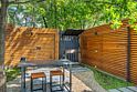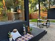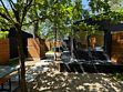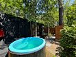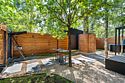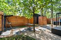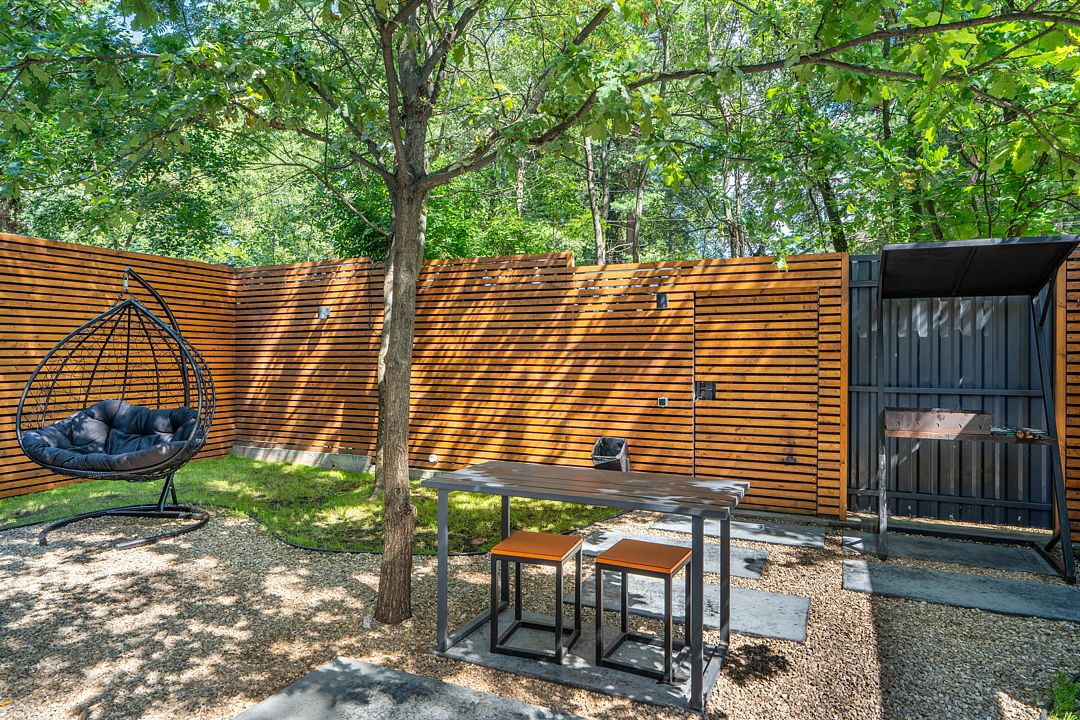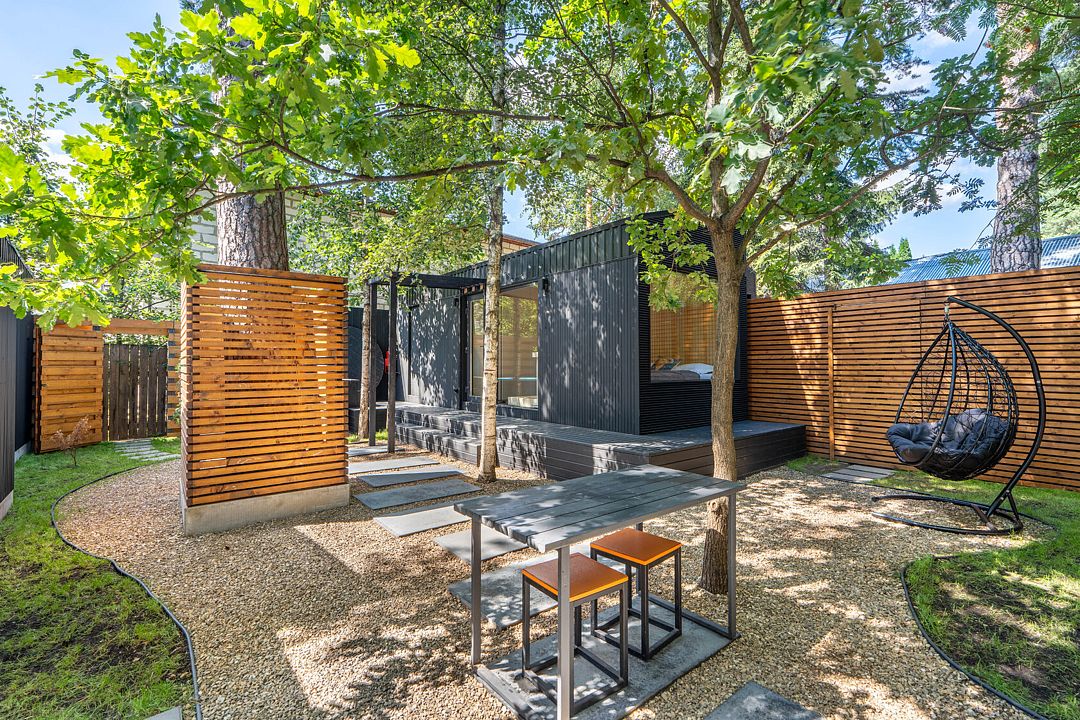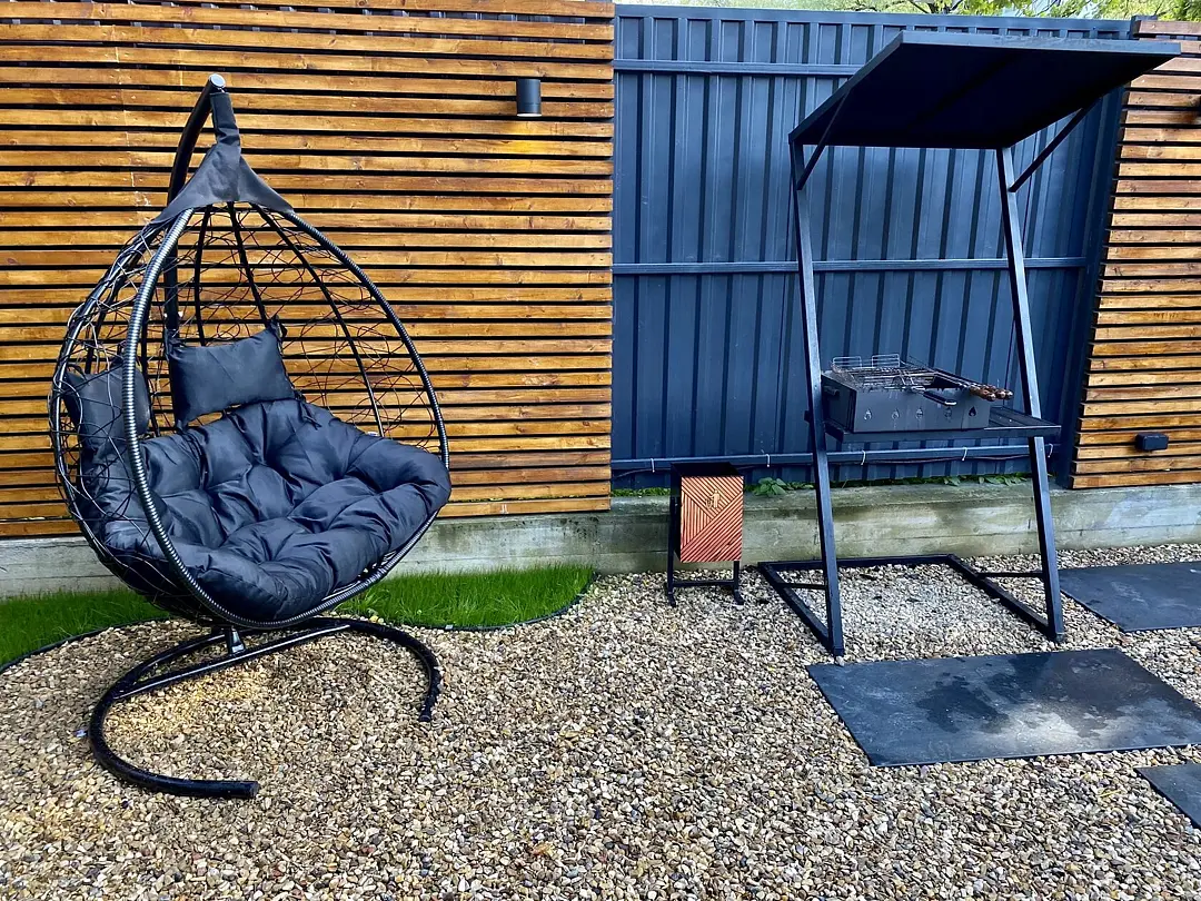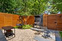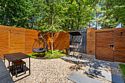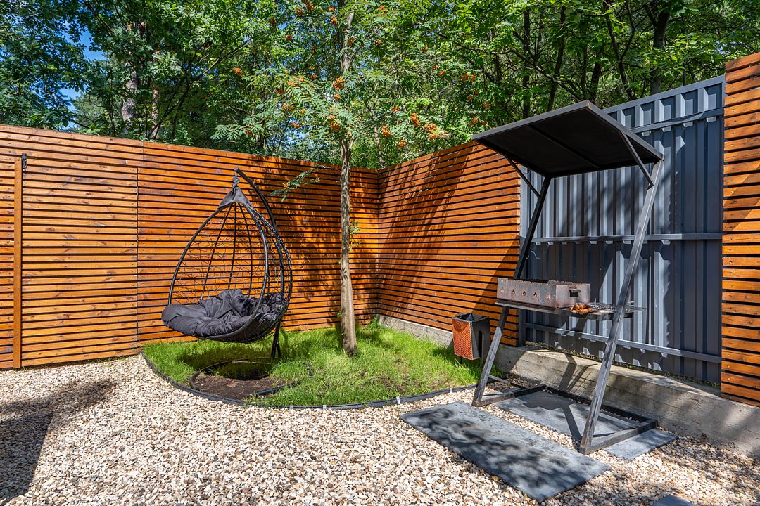На уютной территории есть деревья, лавочки, подвесные коконы, мангал и купель.
