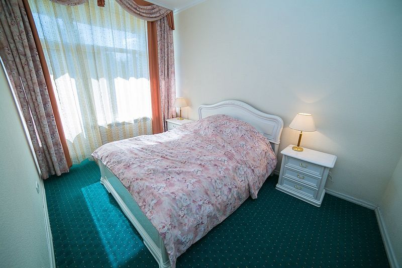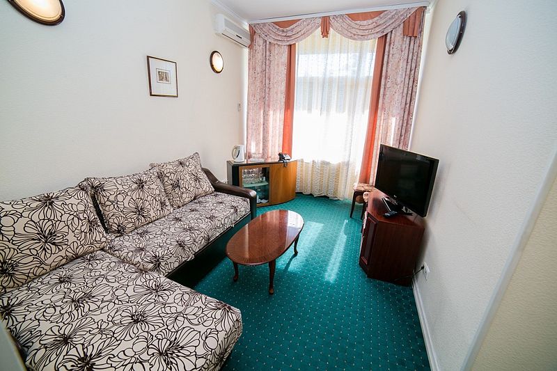 В спальной комнате большая двуспальная кровать, в гостиной раскладывающийся двуспальный диван. В номере: телевизор, холодильник, столик, телефон, сейф, электрический чайник, чайный набор, набор посуды.