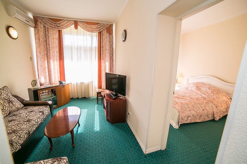 Просторный, двухкомнатный комфортабельный номер с красивым видом из окна, удобной двуспальной кроватью, системой климат-контроля, чайно-кофейным набором.
