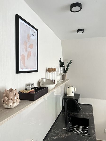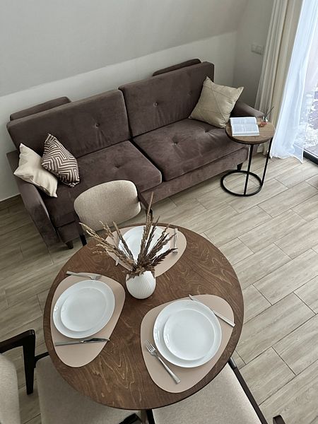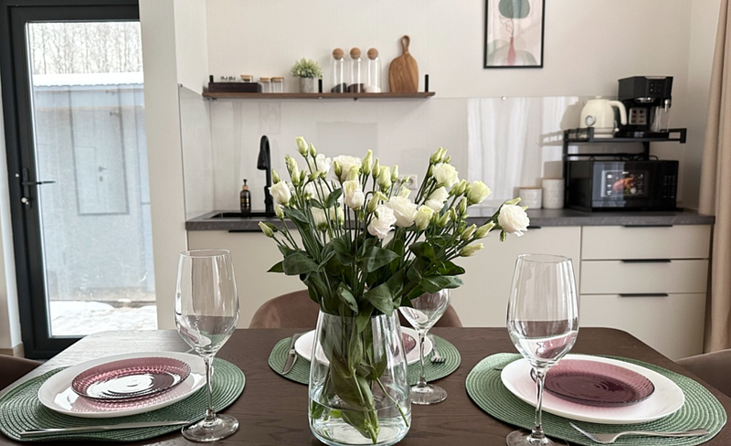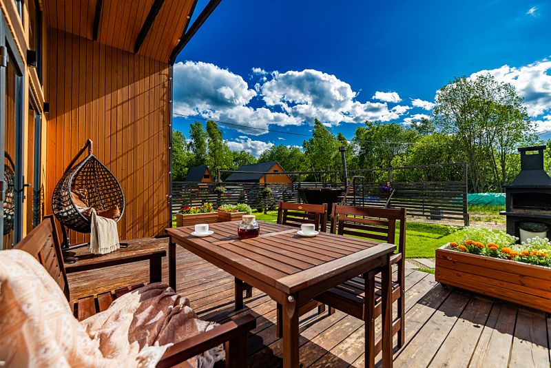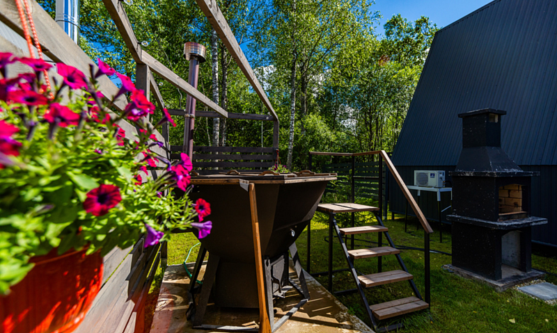 Для пользования гостей — постельное бельё, полотенца, туалетно-косметические принадлежности, фен, посуда, чай и кофе. Каждый дом имеет собственную террасу с мебелью, зоной отдыха и барбекю.