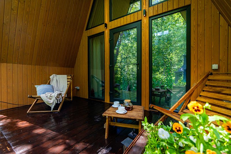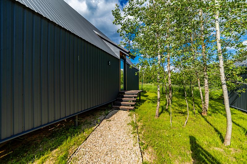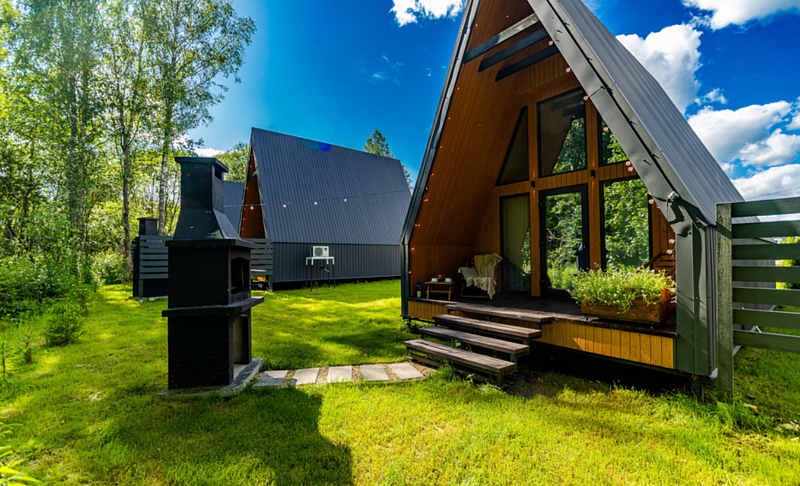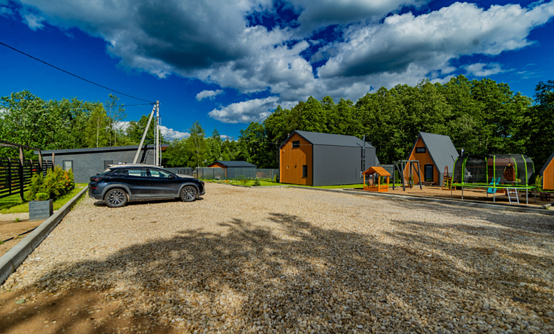 На территории окруженной лесным массивом, находится дома стиля Барнхаус с панорамными окнами, террасами и русской баней на дровах внутри дома с чаном или купелью (оплачивается отдельно) и А-фреймы. Дополнительно на территории есть две отдельно стоящие русские бани. Одна баня на 4-6 человек, вторая баня до 10-14 человек. Все строения выполнены из дерева, с отделкой из экологически чистых материалов. На всей территории базы отдыха работает Wi-Fi. Есть бесплатная частная парковка.