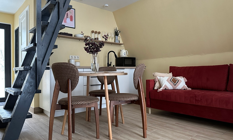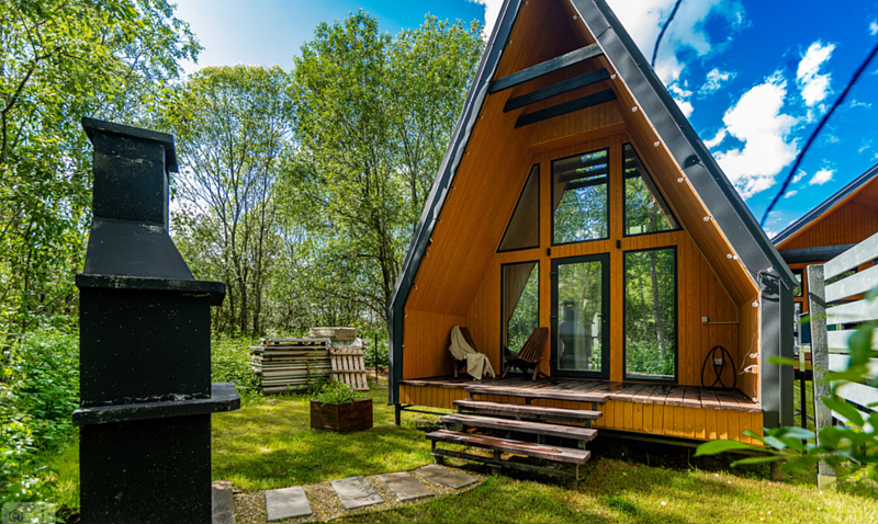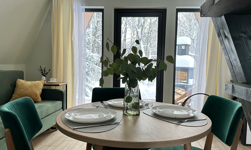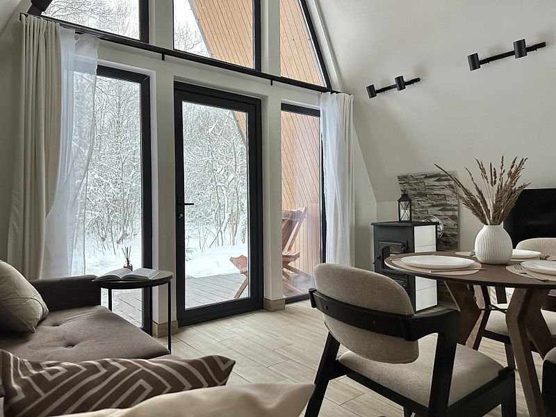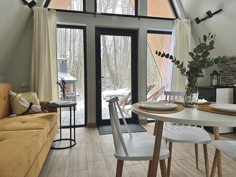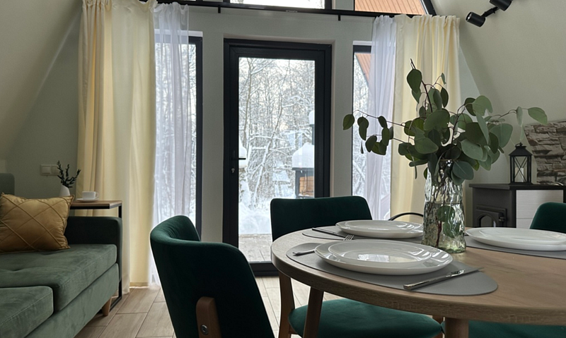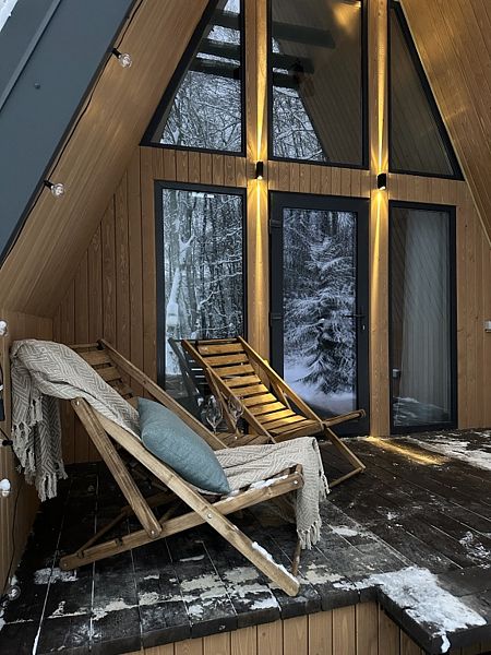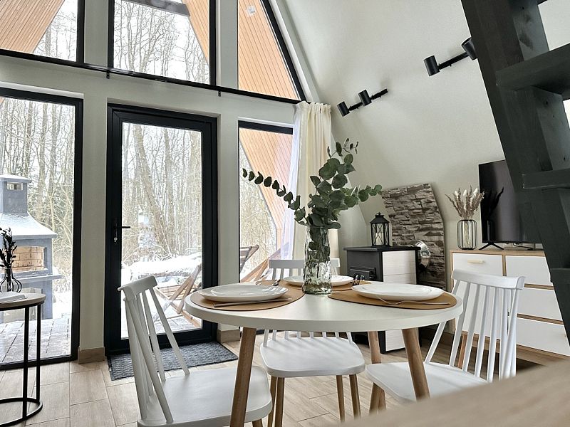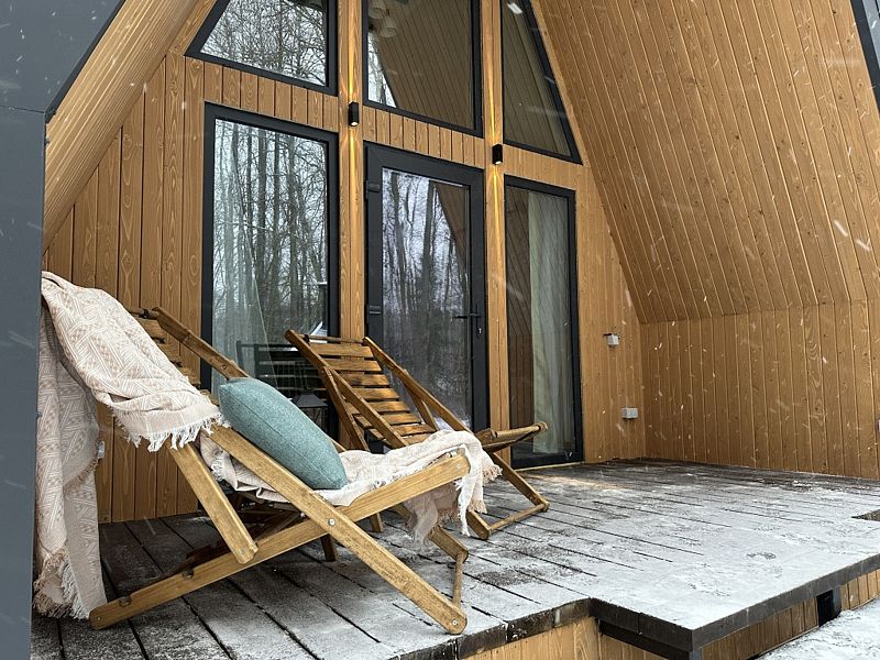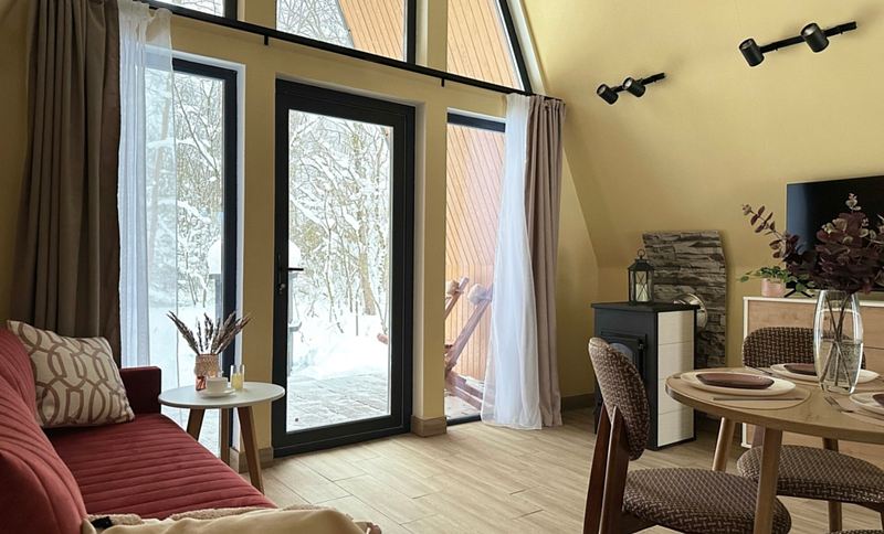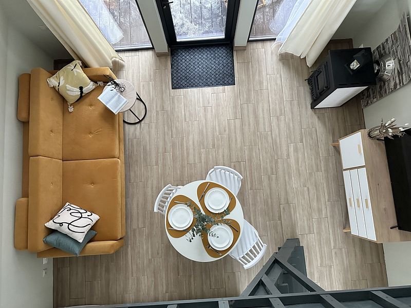 Имеет 2 этажа, рассчитан максимально на 4 человека. На первом этаже дома, просторная гостиная с диваном, телевизором, камином, кухонная зона оборудована современным кухонным гарнитуром и обеденным столом. В кухне есть: плита, холодильник с морозильником, микроволновка, чайник. Также на первом этаже есть санузел с душевой кабиной. На втором этаже расположена роскошная двуспальная кровать. В доме теплые полы и дровяной камин.