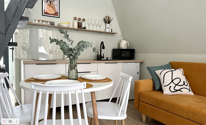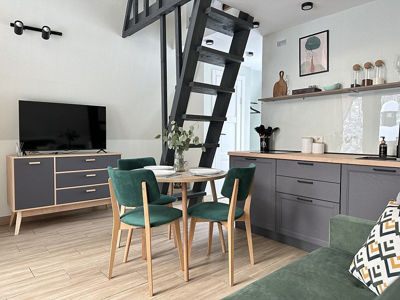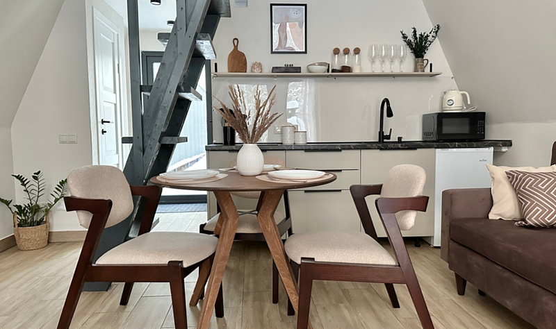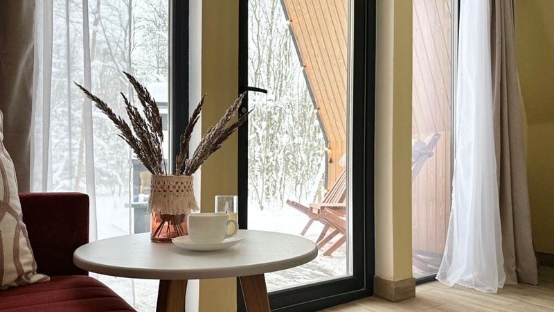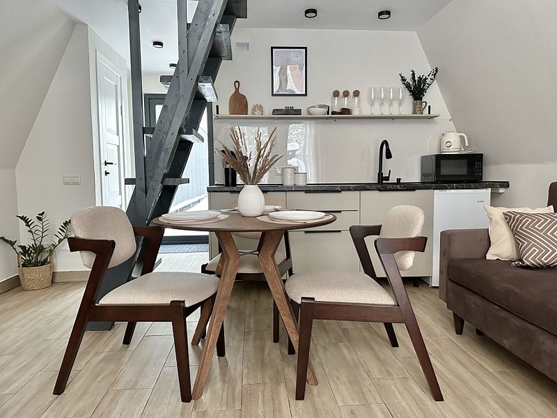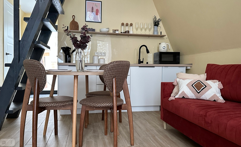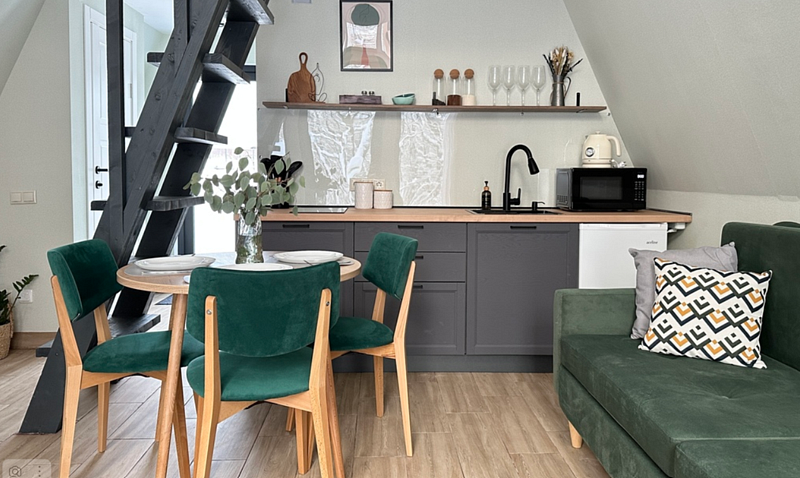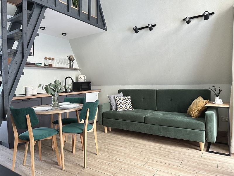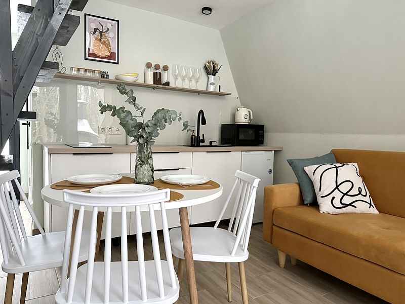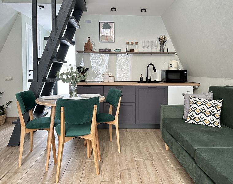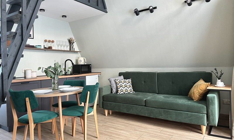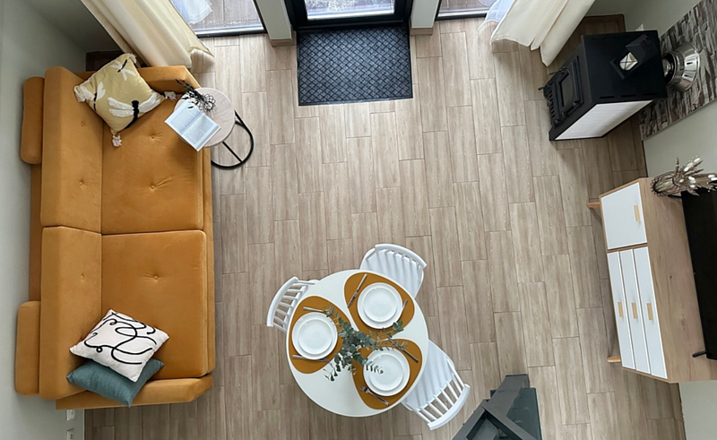 Имеет 2 этажа, рассчитан максимально на 4 человека. На первом этаже дома, просторная гостиная с диваном, телевизором, камином, кухонная зона оборудована современным кухонным гарнитуром и обеденным столом. В кухне есть: плита, холодильник с морозильником, микроволновка, чайник. Также на первом этаже есть санузел с душевой кабиной. На втором этаже расположена роскошная двуспальная кровать. В доме теплые полы и дровяной камин.