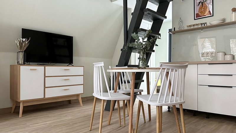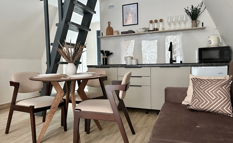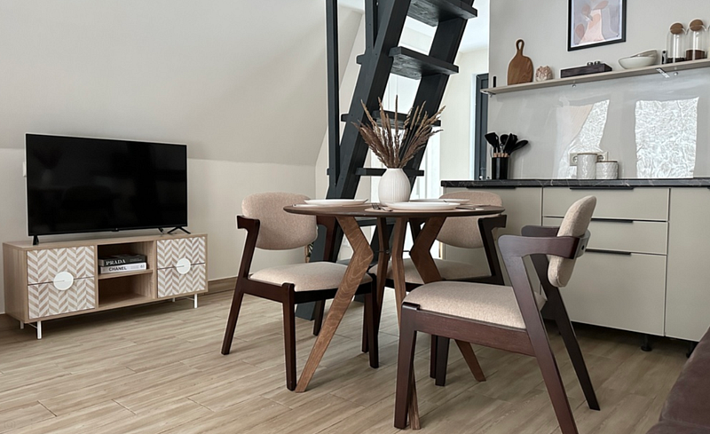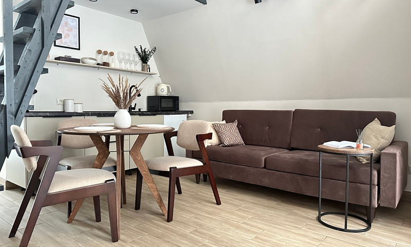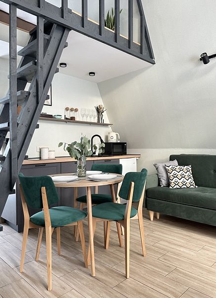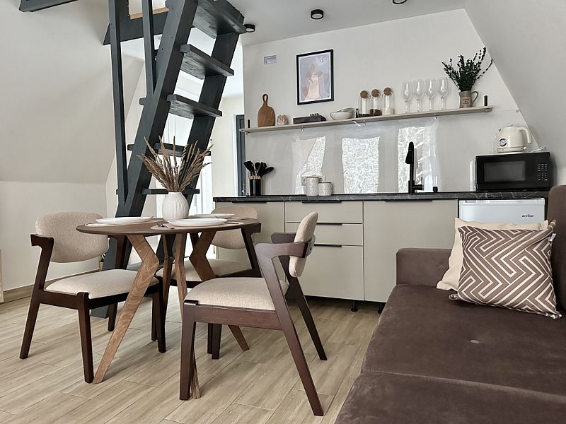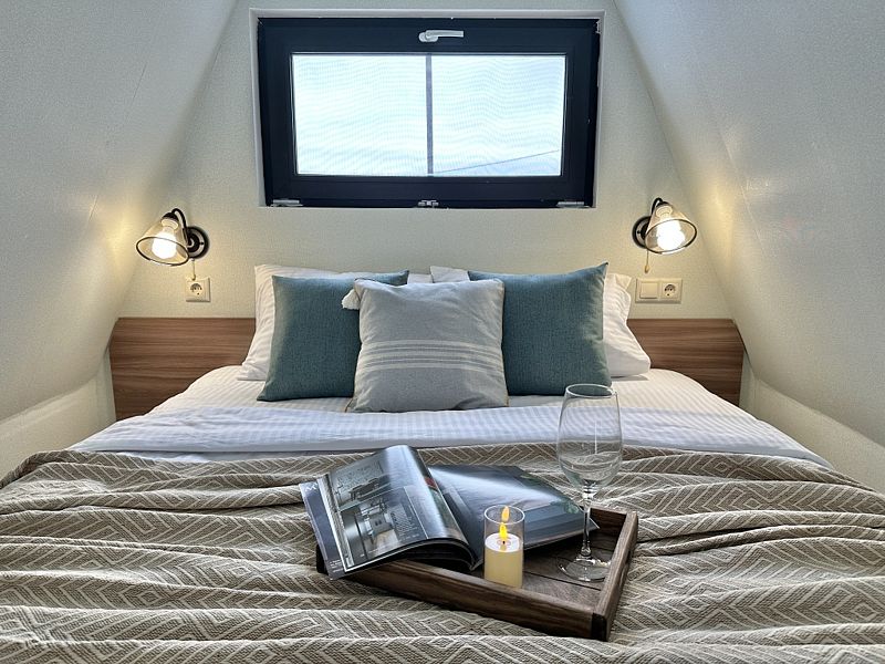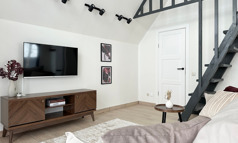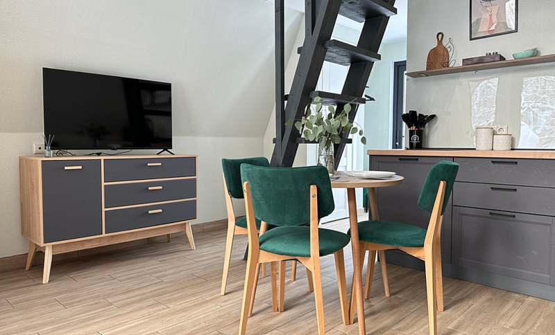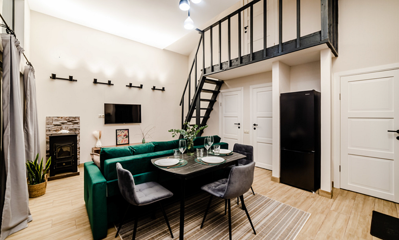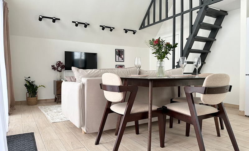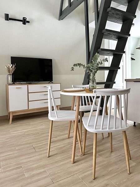 Имеет 2 этажа, рассчитан максимально на 4 человека. На первом этаже дома, просторная гостиная с диваном, телевизором, камином, кухонная зона оборудована современным кухонным гарнитуром и обеденным столом. В кухне есть: плита, холодильник с морозильником, микроволновка, чайник. Также на первом этаже есть санузел с душевой кабиной. На втором этаже расположена роскошная двуспальная кровать. В доме теплые полы и дровяной камин.