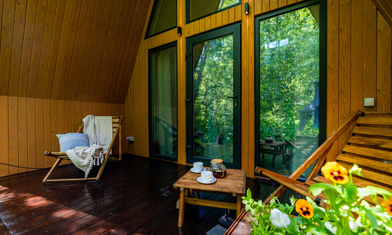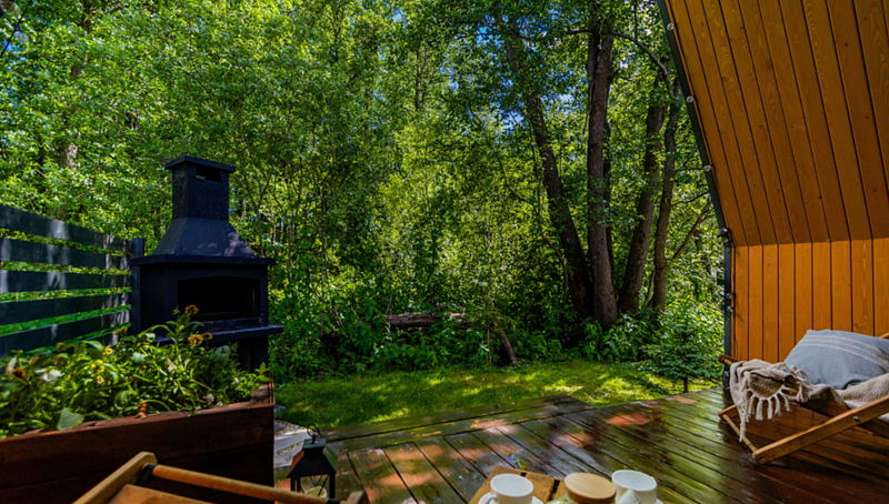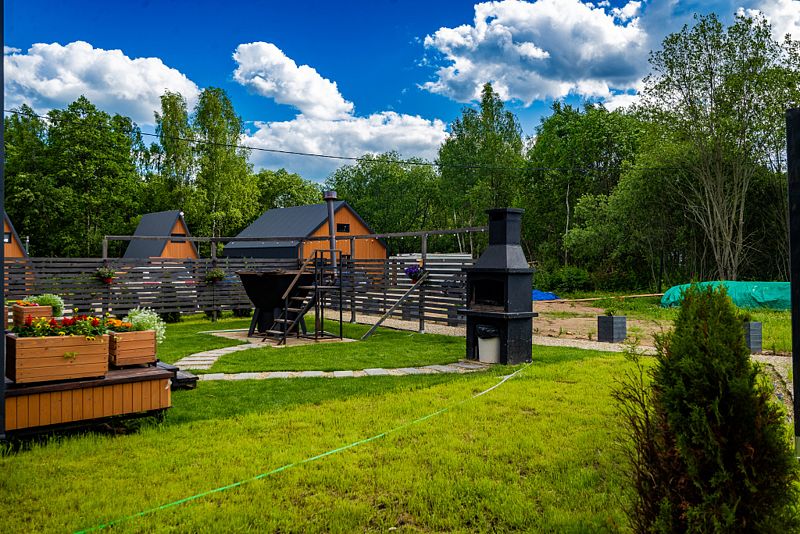Вокруг домиков находится лес, можно собирать грибы. От детской площадки можно пройти по деревянной дорожке по лесу к небольшой речке.