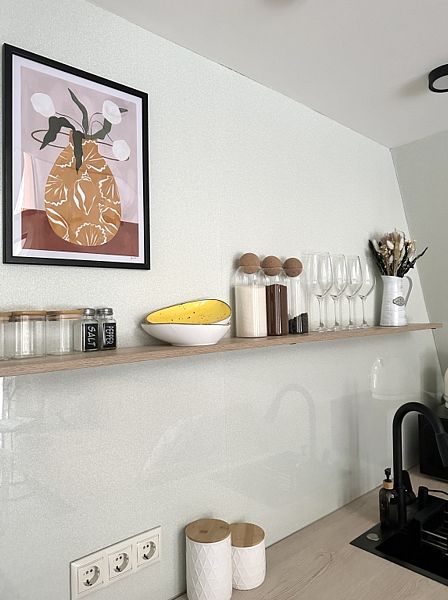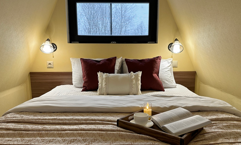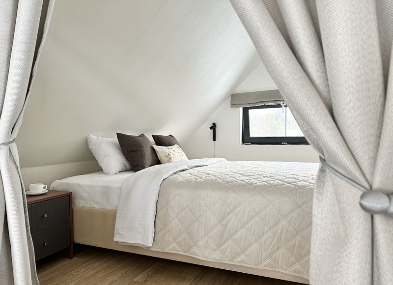 Имеет 2 этажа, рассчитан максимально на 6 человек. На первом этаже, просторная гостиная с диваном, телевизором, камином, кухонная зона оборудована современным кухонным гарнитуром и обеденным столом. В кухне есть: плита, холодильник с морозильником, посудомоечная машина, микроволновка, чайник, кофемашина. Также на первом этаже есть санузел и современная ванная комната с душевой кабиной и баней на дровах. Спальня с двумя уютными односпальными кроватями. На втором этаже расположена вторая спальня с роскошной двуспальной кроватью. В доме теплые полы.