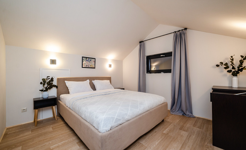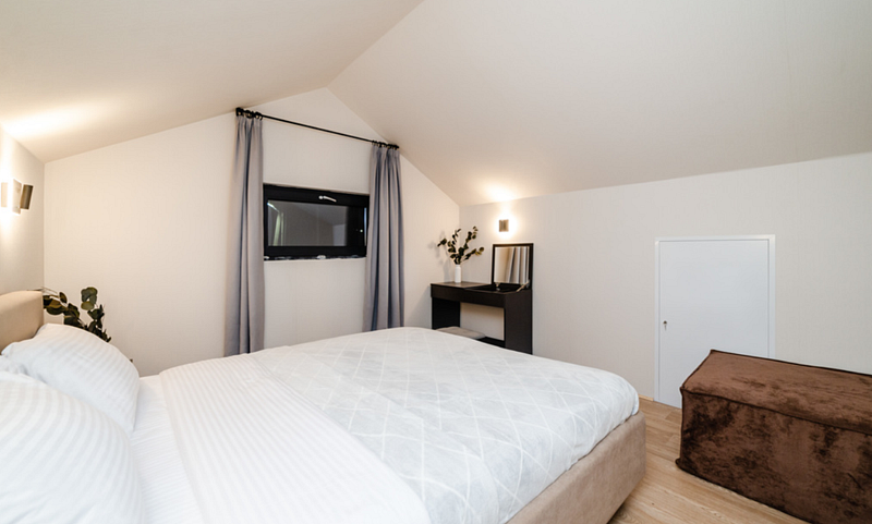 Имеет 2 этажа, рассчитан максимально на 10 человек. На первом этаже просторная гостиная с диваном, телевизором, кухонная зона оборудована современным кухонным гарнитуром и обеденным столом. Так же на первом этаже есть санузел и современная ванная комната с душевой кабиной и баней на дровах. Две спальни на первом этаже. Одна спальня с двухспальной кроватью, вторая с двумя уютными односпальными кроватями. На втором этаже расположена третья спальня с роскошной двуспальной кроватью и односпальной кроватью. Во всем доме теплые полы.
