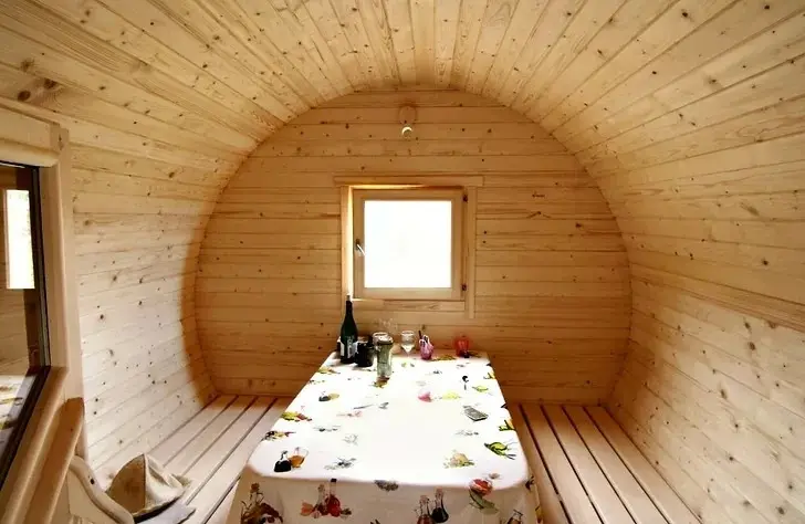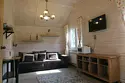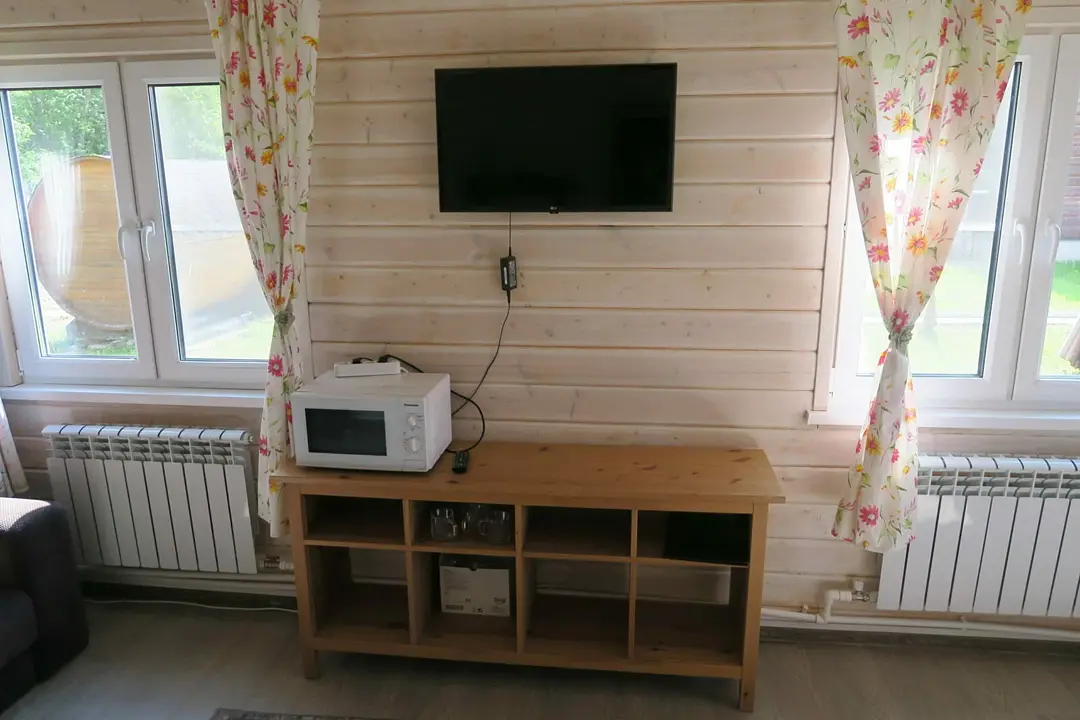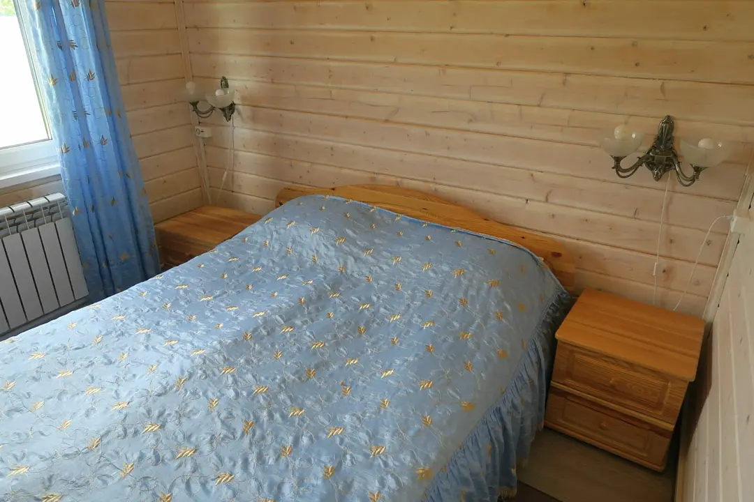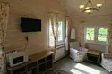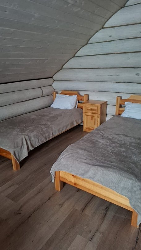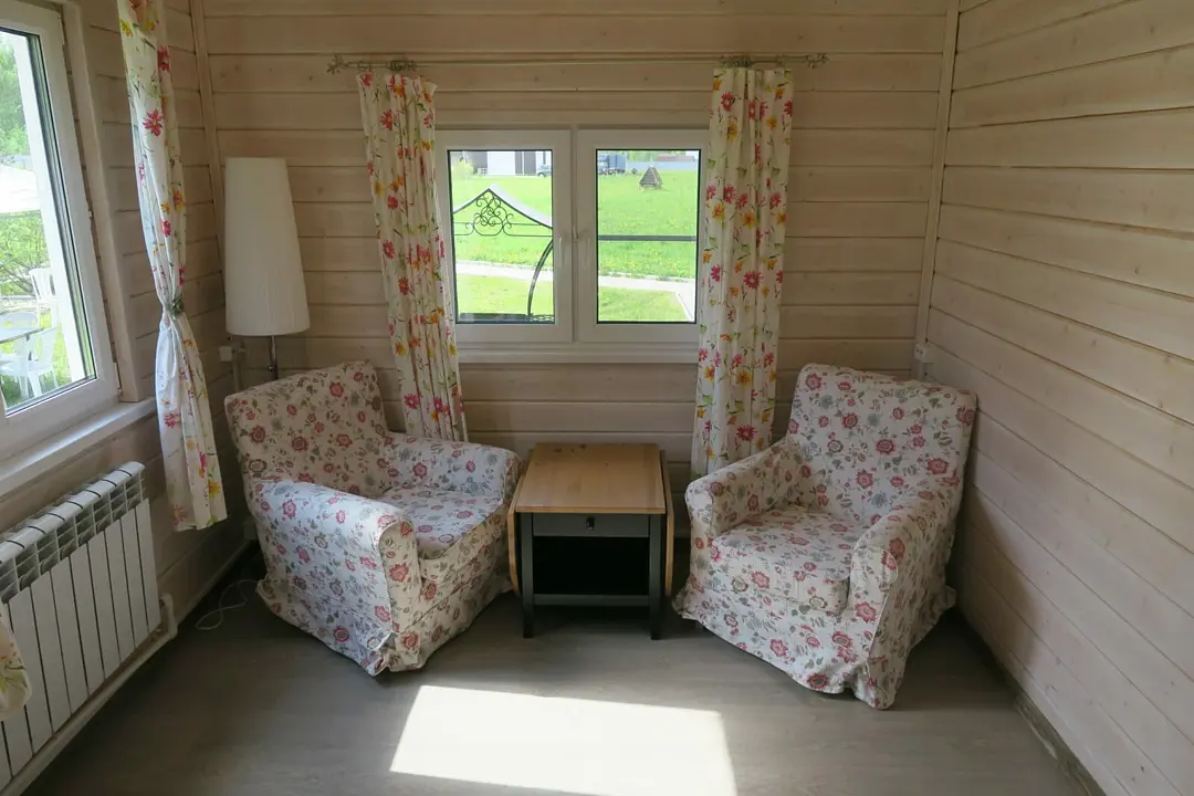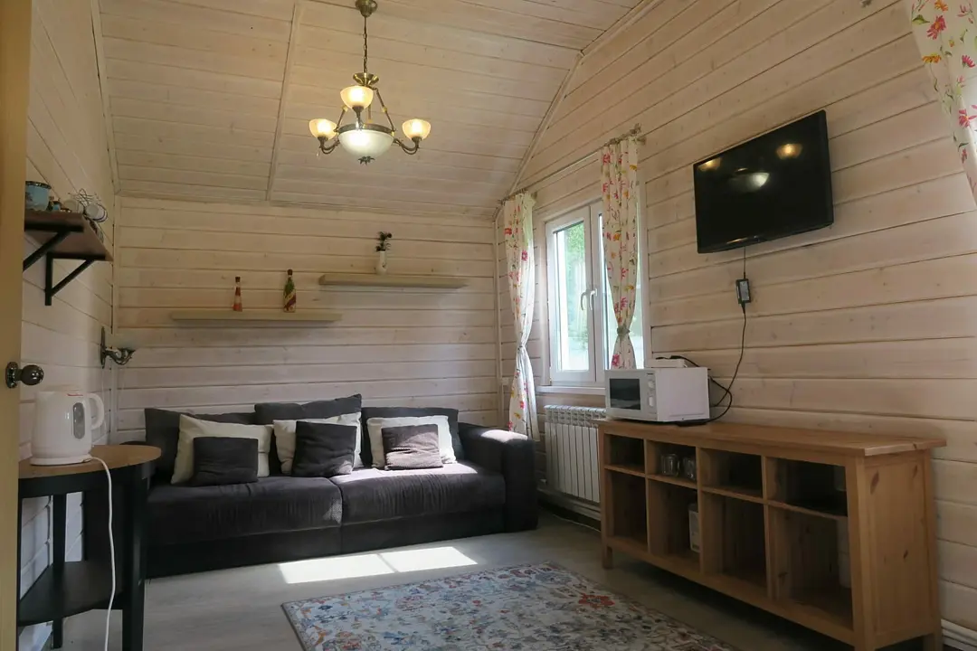 Просторный двухэтажный таунхаус площадью 98 м² расположен в половине деревянного дома, построенного из рубленного бревна. В таунхаусе 8 спальных мест, расположенных на двух этажах. Для компаний от 8 до 14 человек дополнительно открывается большой зал площадью 46 м².