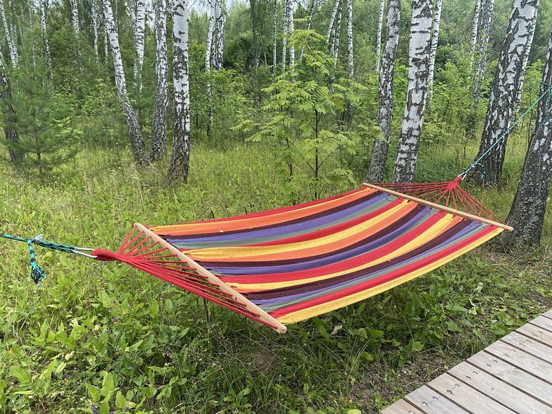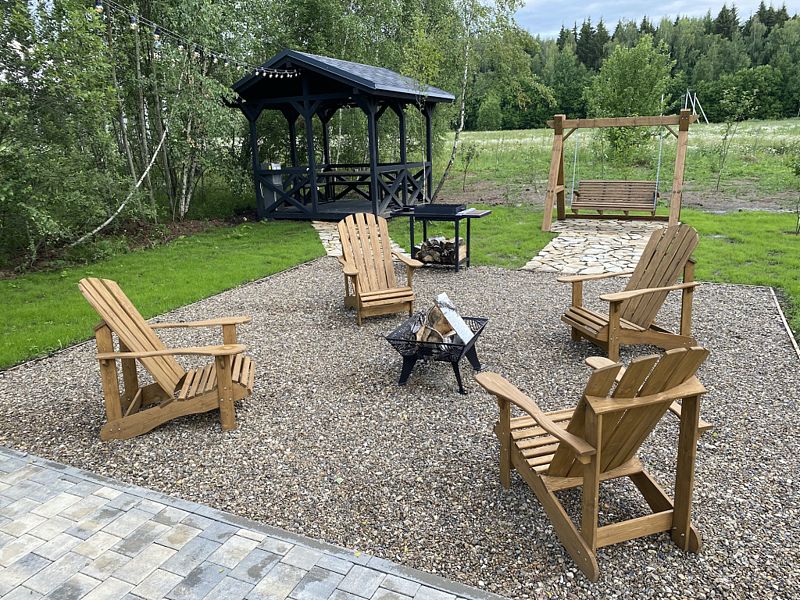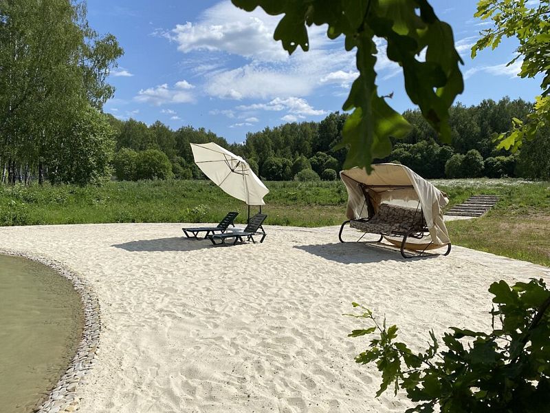Большой пляж из белоснежного кварцевого песка, с шезлонгами и качелями. И всё это в окружении леса! Под пляжем оборудована система дренажа, благодаря которой песок всегда сухой, даже после дождя.