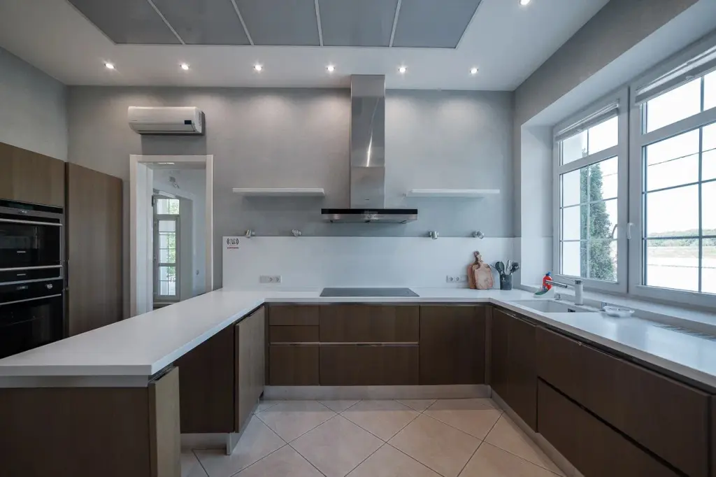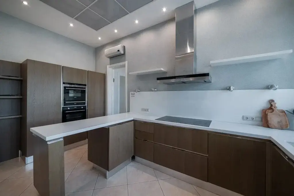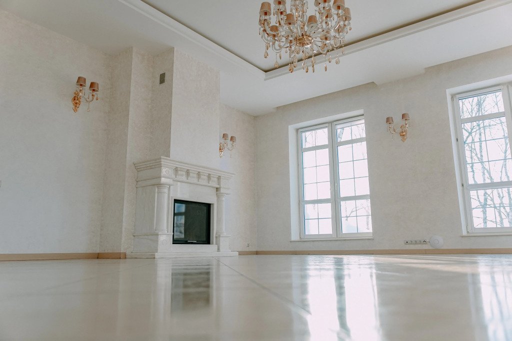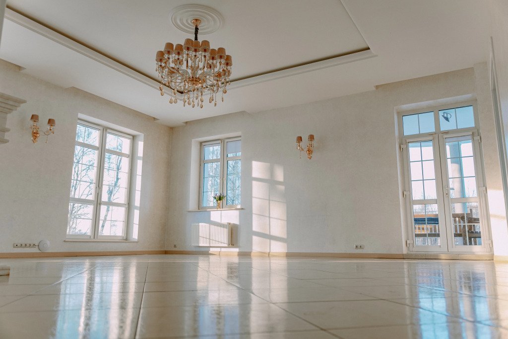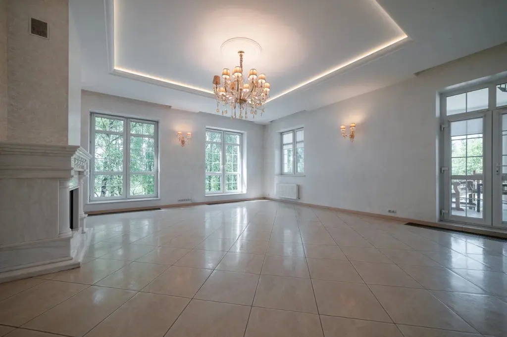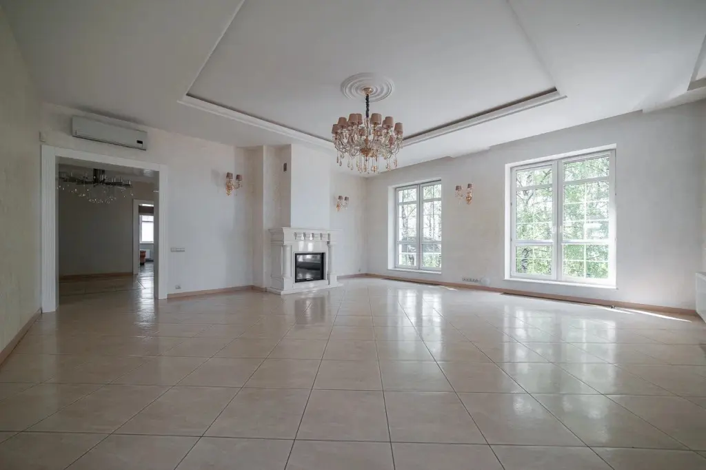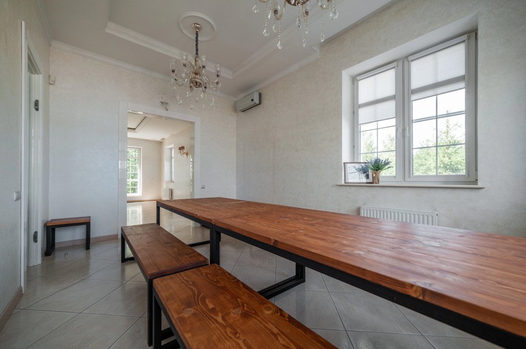 На первом этаже находится банкетный зал в классическом стиле, оформленный в светлых тонах и с камином, зал может вместить до 40 человек. Здесь же расположены кухня и отдельная столовая зона.