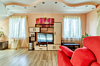Участок размером 30 соток с ухоженным спортивным газоном украшают величественные голубые ели и сосны. Коттедж рассчитан на комфортное размещение до 10 человек. К услугам гостей высокоскоростной интернет, кабельное телевидение и кондиционеры. Дом полностью меблирован и оснащен всей необходимой бытовой техникой. На первом этаже предусмотрены теплые полы, установлено круглогодичное отопление и подведены центральные коммуникации. Также на первом этаже находится просторная кухня-столовая (18 кв.м.) с зоной для отдыха у телевизора, одна спальня с двуспальной кроватью и совмещенный санузел с ванной. Второй этаж включает две уютные спальни и гостиную с двумя угловыми диванами, домашним кинотеатром и караоке.