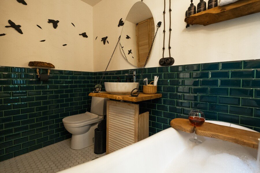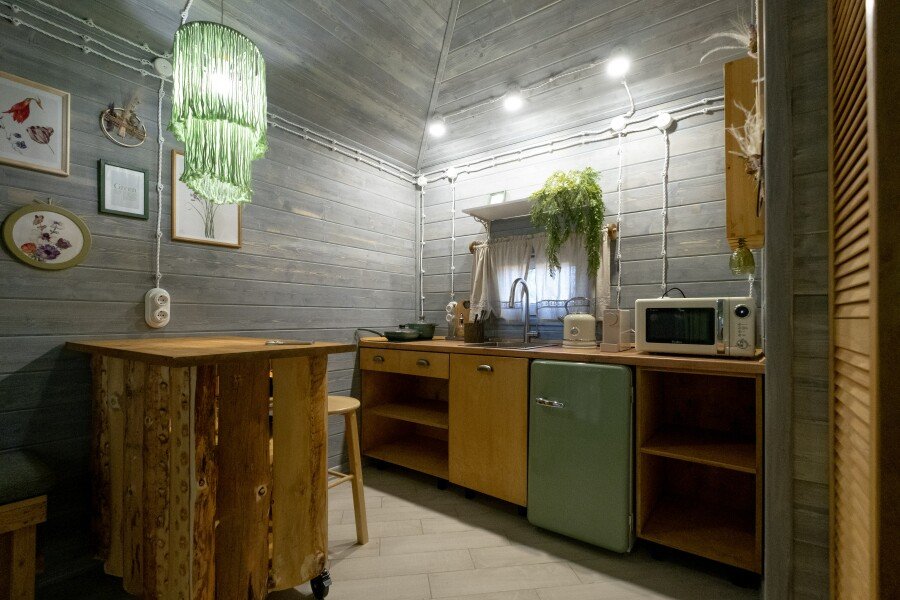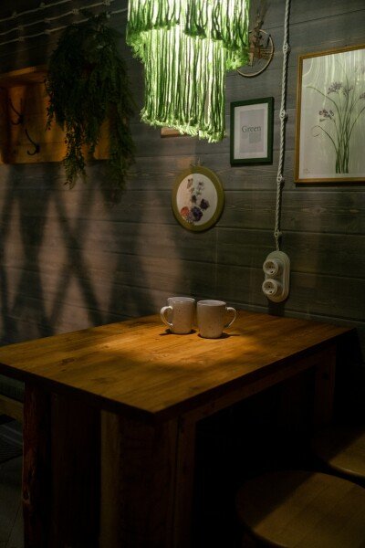Салатово-зеленые мотивы и древесные элементы создают уникальную атмосферу.