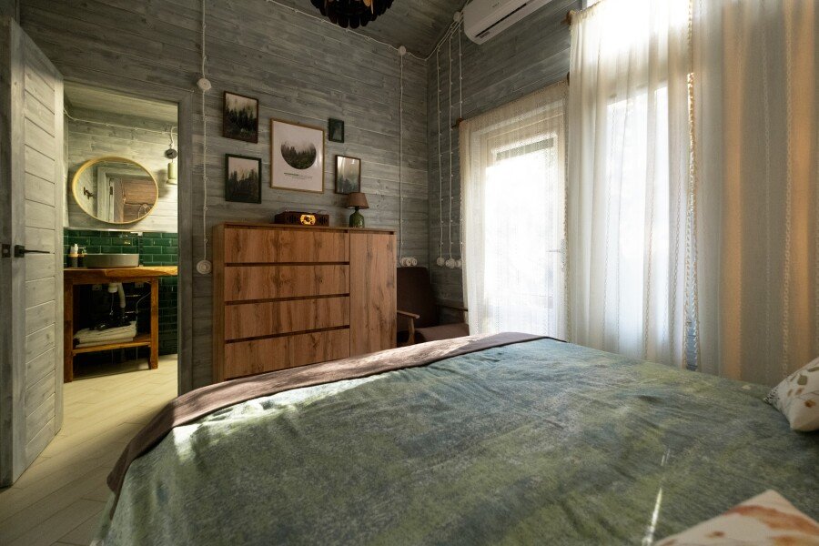 Панорамное окно открывает живописный вид на природу, а уютная кровать-татами, постеры с растительными мотивами и подвесное кресло приглашают расслабиться.