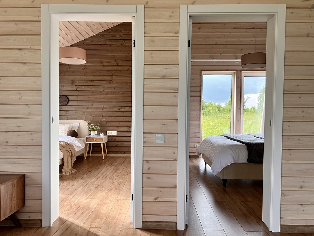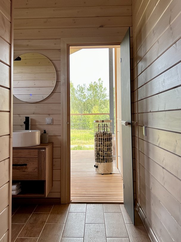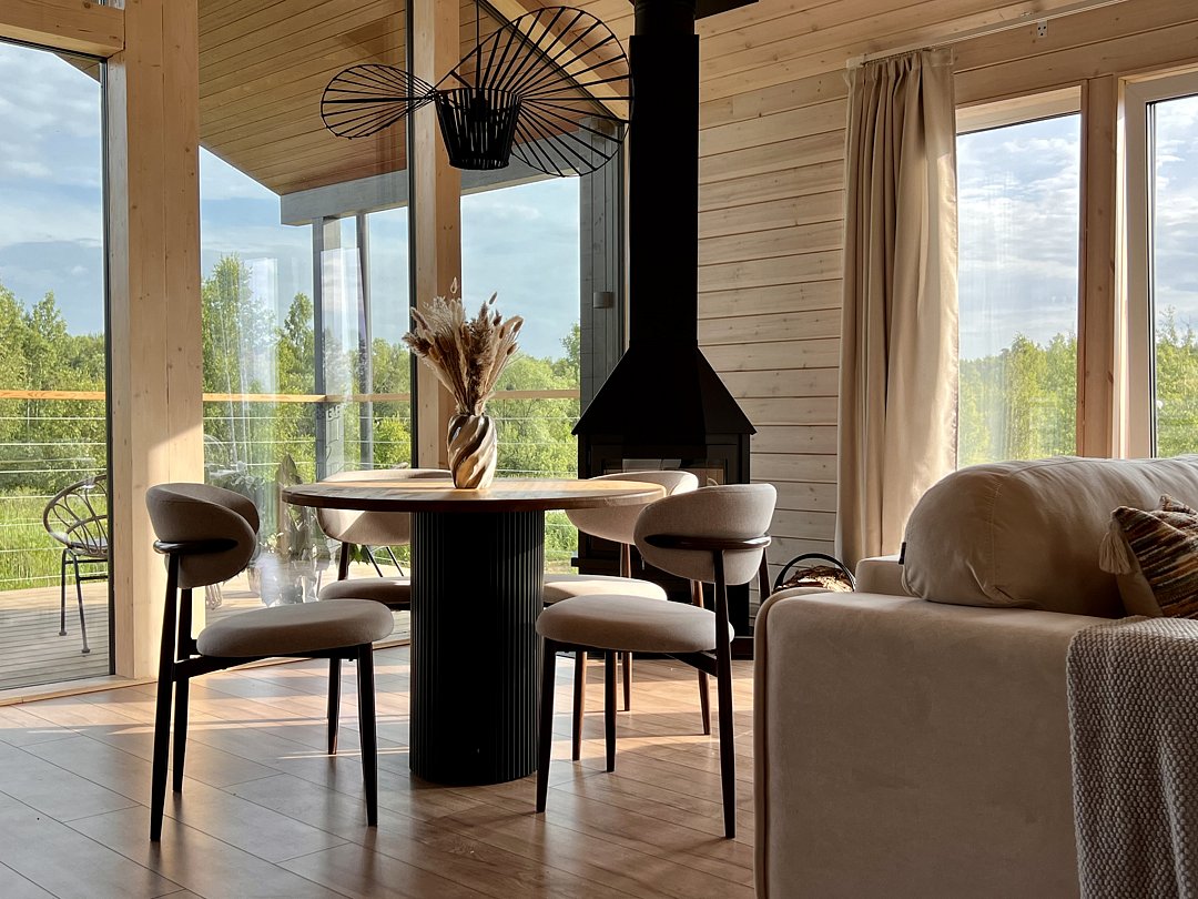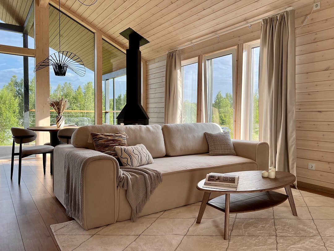 Просторные дома на 6 и 8 гостей подойдут для отдыха большой семьи или компании друзей. Каждый коттедж оснащён кухней, удобной мебелью, гостиной с большим диваном. Сауна оплачивается отдельно.