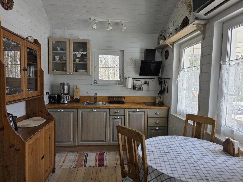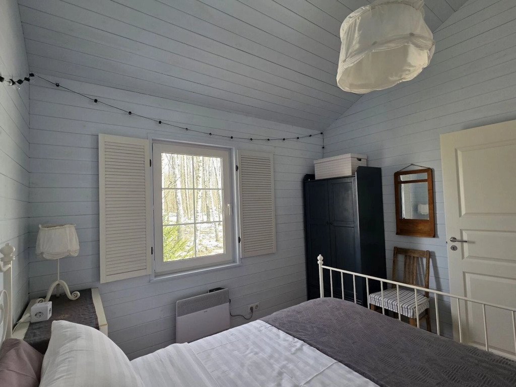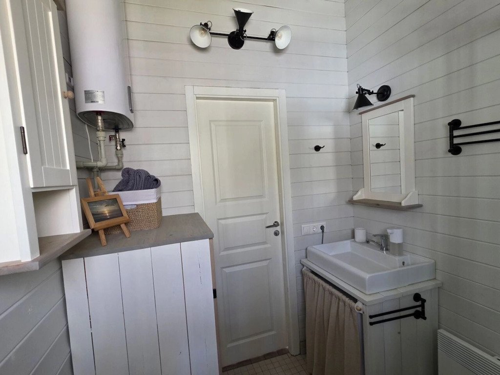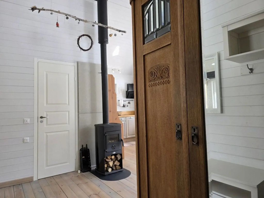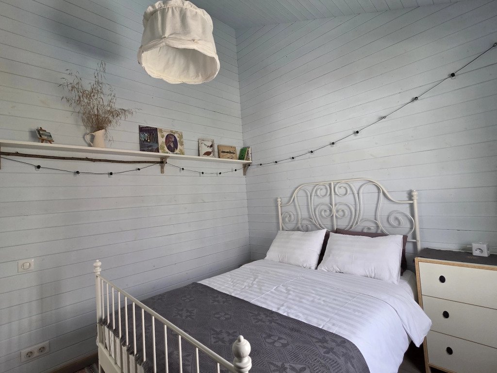 В частном доме 2 спальни: в одной двуспальная кровать, в другой кушетка: раскладывается в двуспальное место. Кухня-гостиная: диван, телевизор с подпиской на онлайн кинотеатр, Wi-Fi, печь-камин, кондиционер. В кухне есть индукционная плита, посудомоечная машина, холодильник, микроволновка, чайник, кофеварка. Санузел: душевая кабина, унитаз, раковина, стиральная машина, бойлер, фен, косметические средства. К услугам гостей постельное бельё, комплект полотенец. За доплату предоставляются детская кроватка и стул для кормления.
