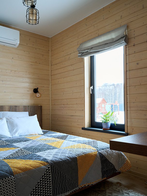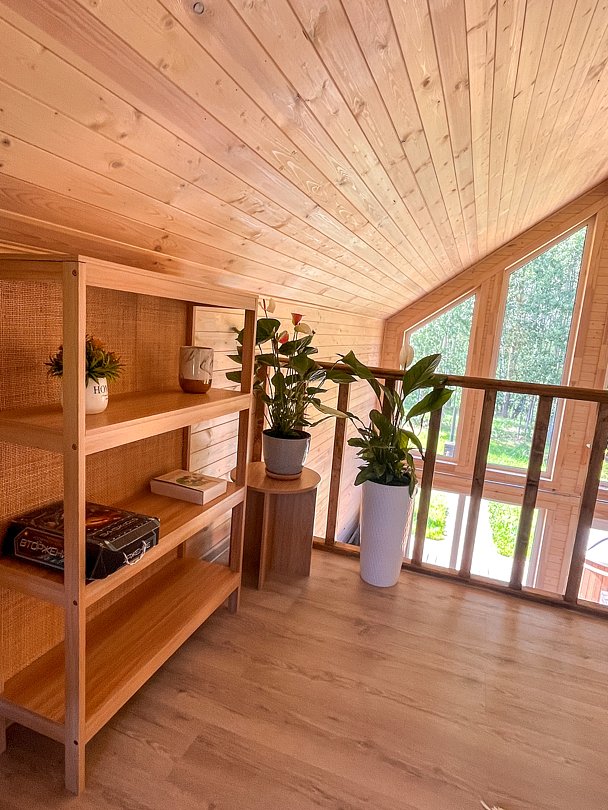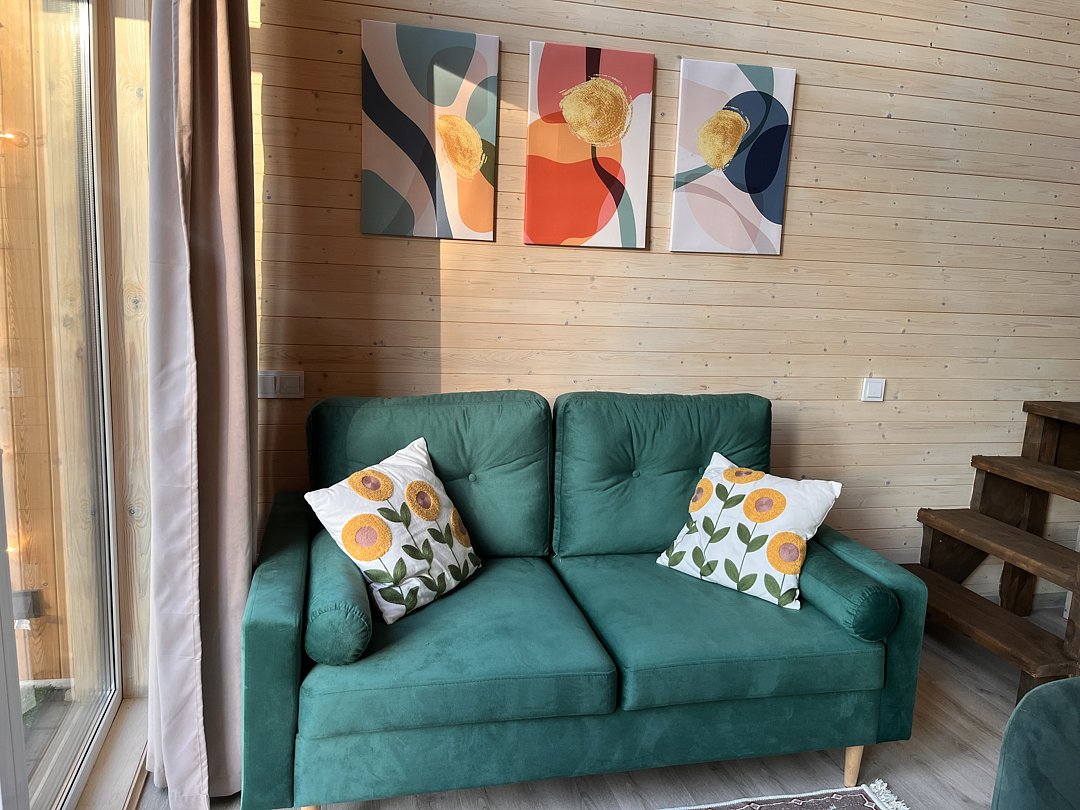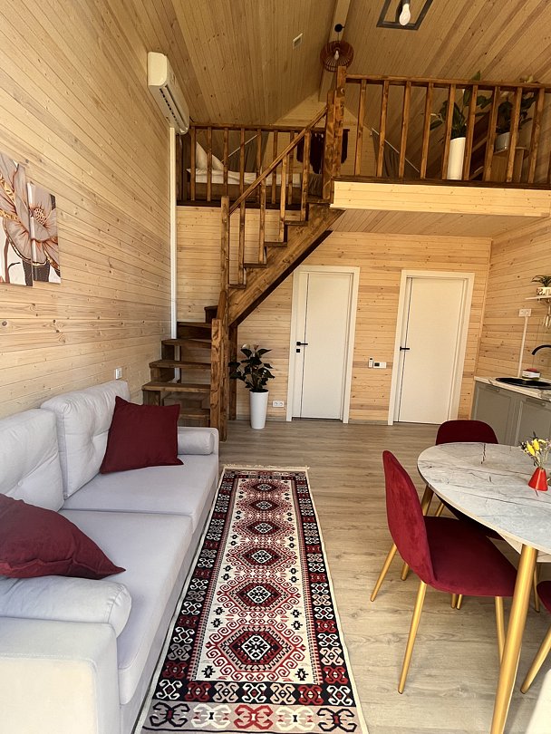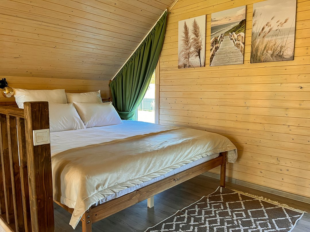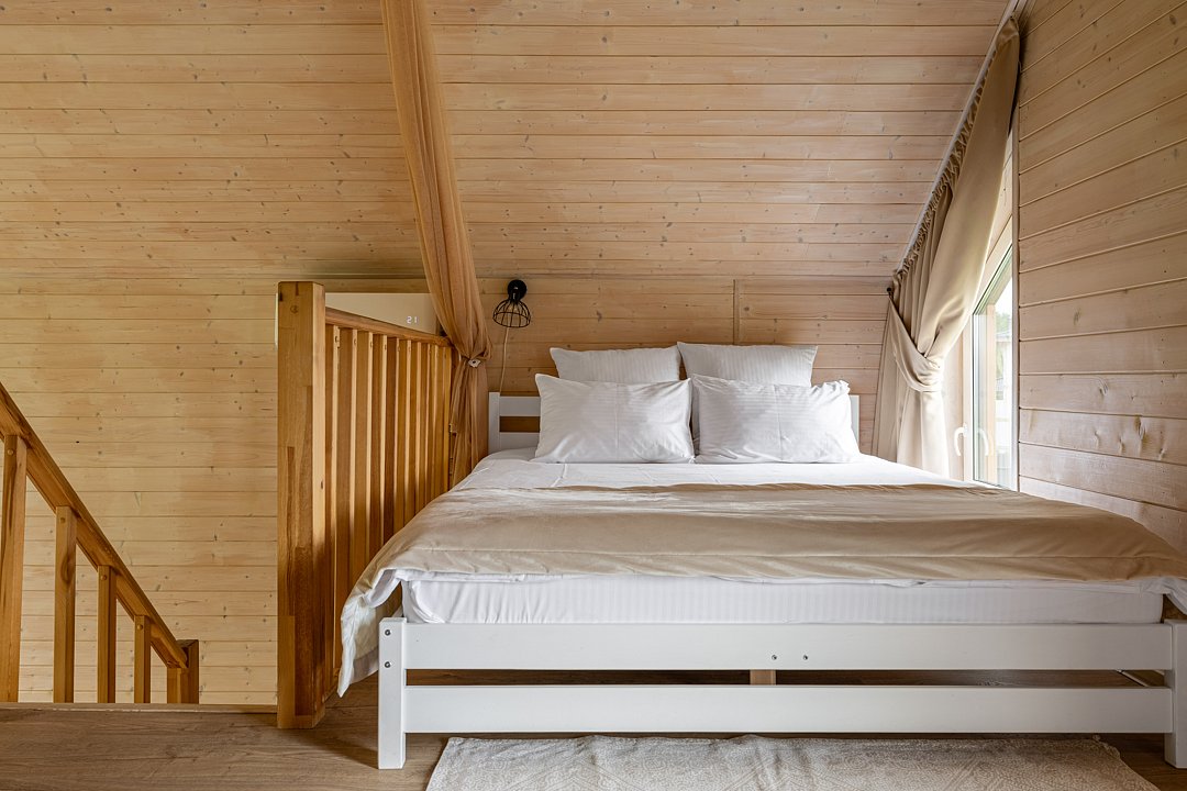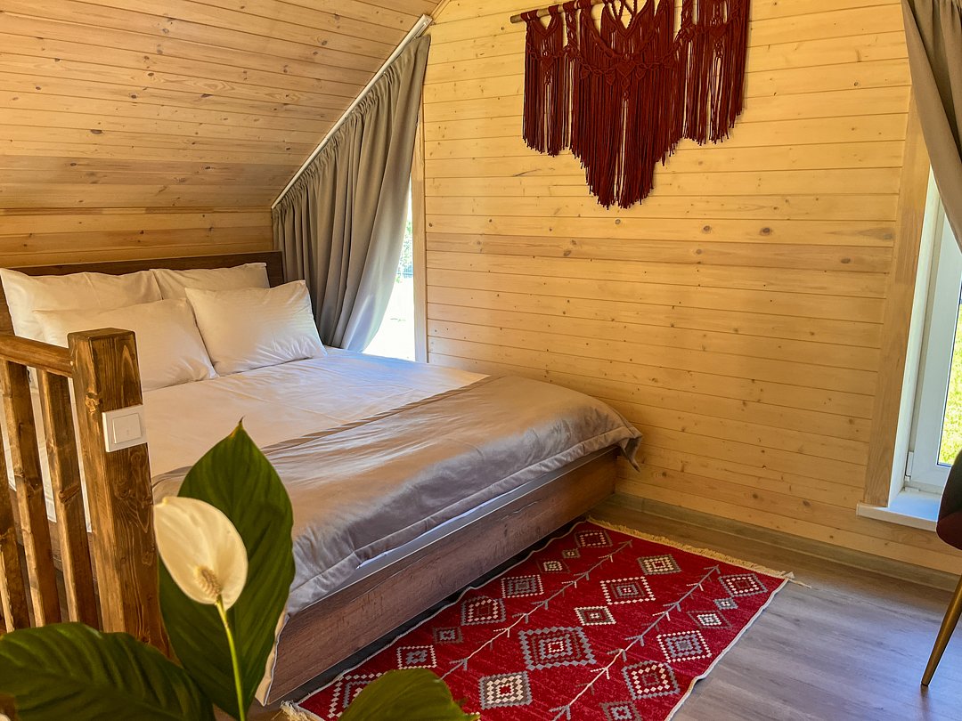 Уютный домик в стиле барнхаус, комфортный для размещения до 4-х человек. На лофте двуспальная кровать, на первом этаже раскладной диван.