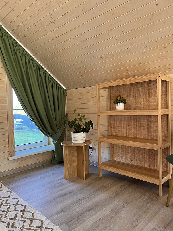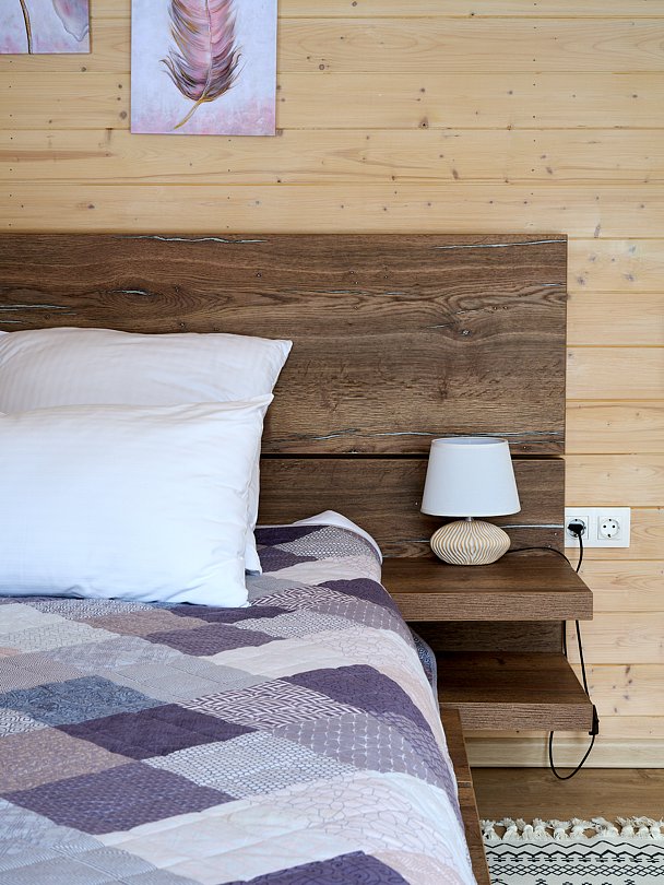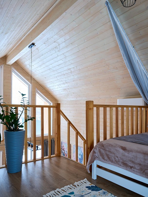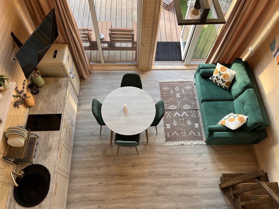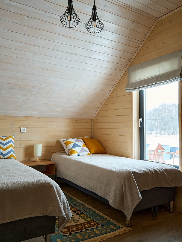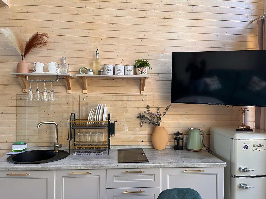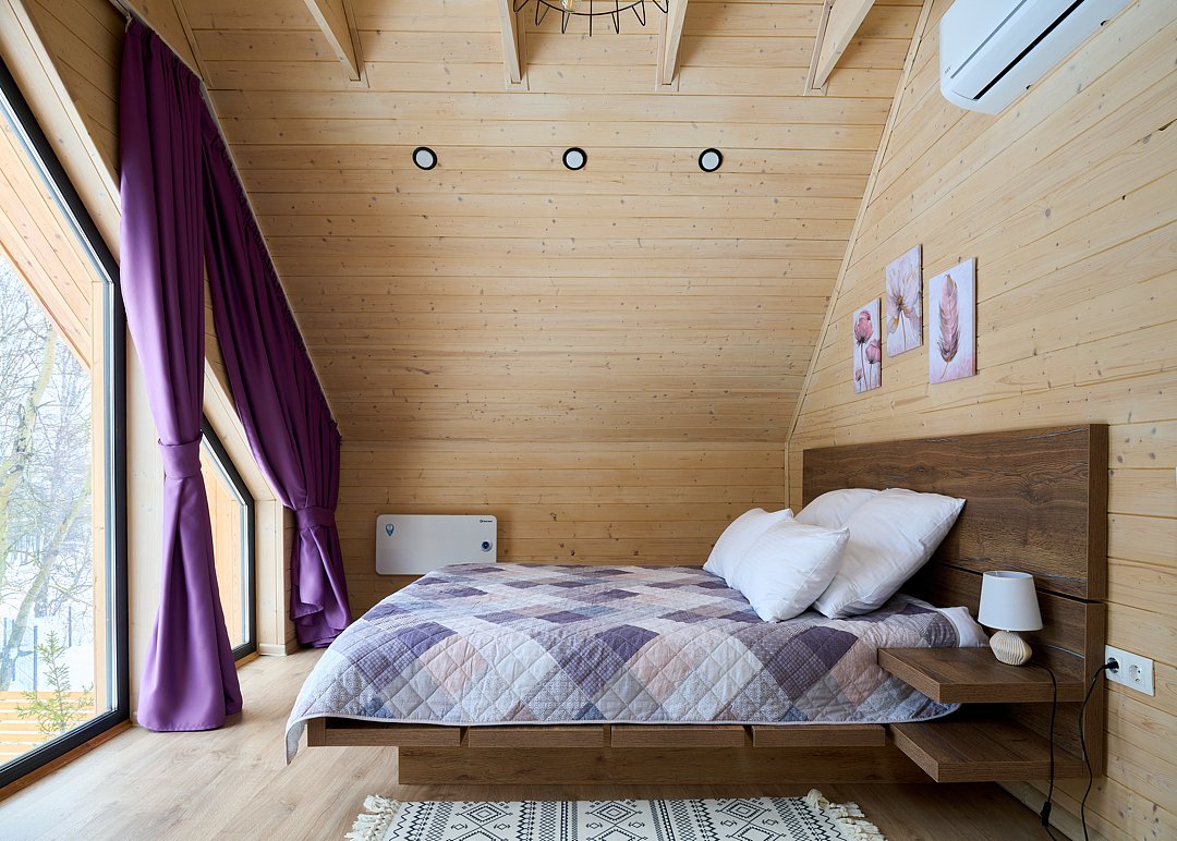 Уютный домик в стиле барнхаус, комфортный для размещения до 4-х человек. На лофте двуспальная кровать, на первом этаже раскладной диван.