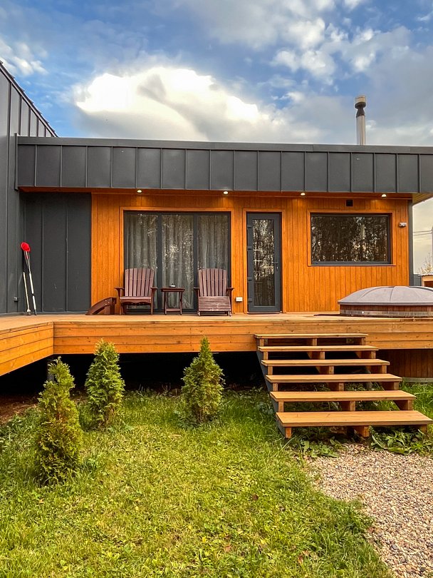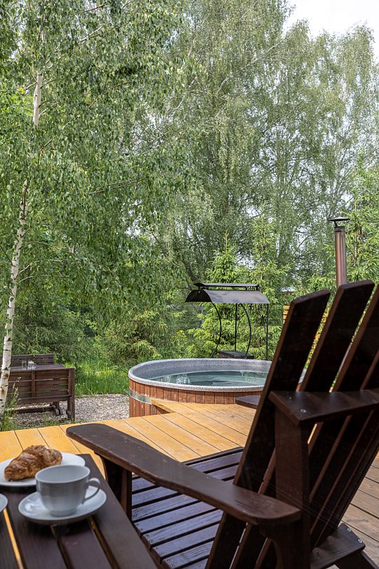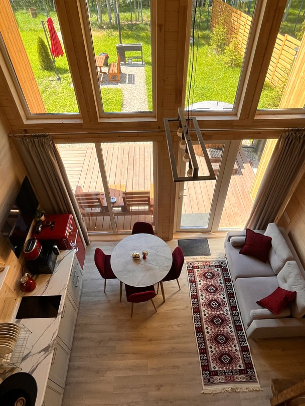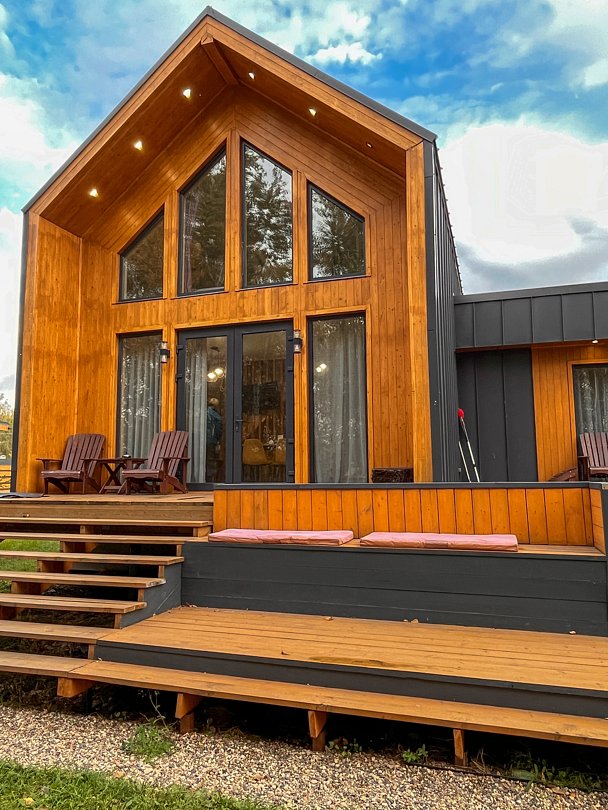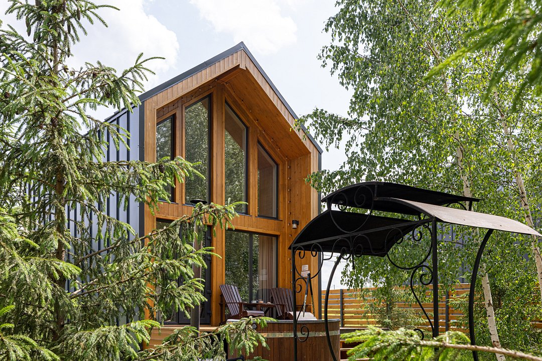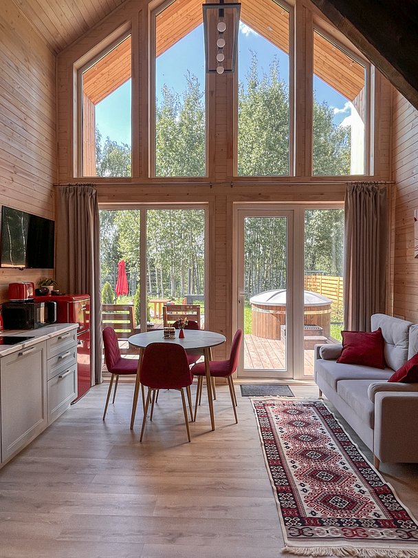 Вас будет ждать один просторный дом с баней, рассчитанный на компанию до 6 человек и четыре комфортабельных дома для 2-4 человек. Все домики оборудованы открытыми террасами с уютными креслами. У каждого есть своя горячая купель и зона для барбекю с уличной мебелью. Из окон открывается восхитительный вид на окружающую природу.