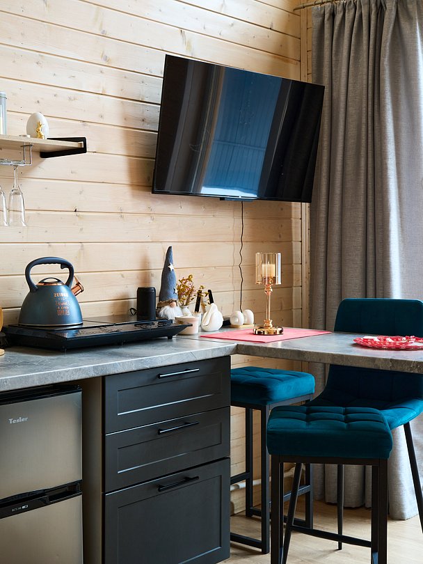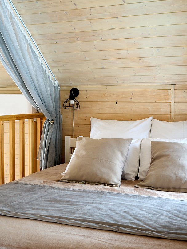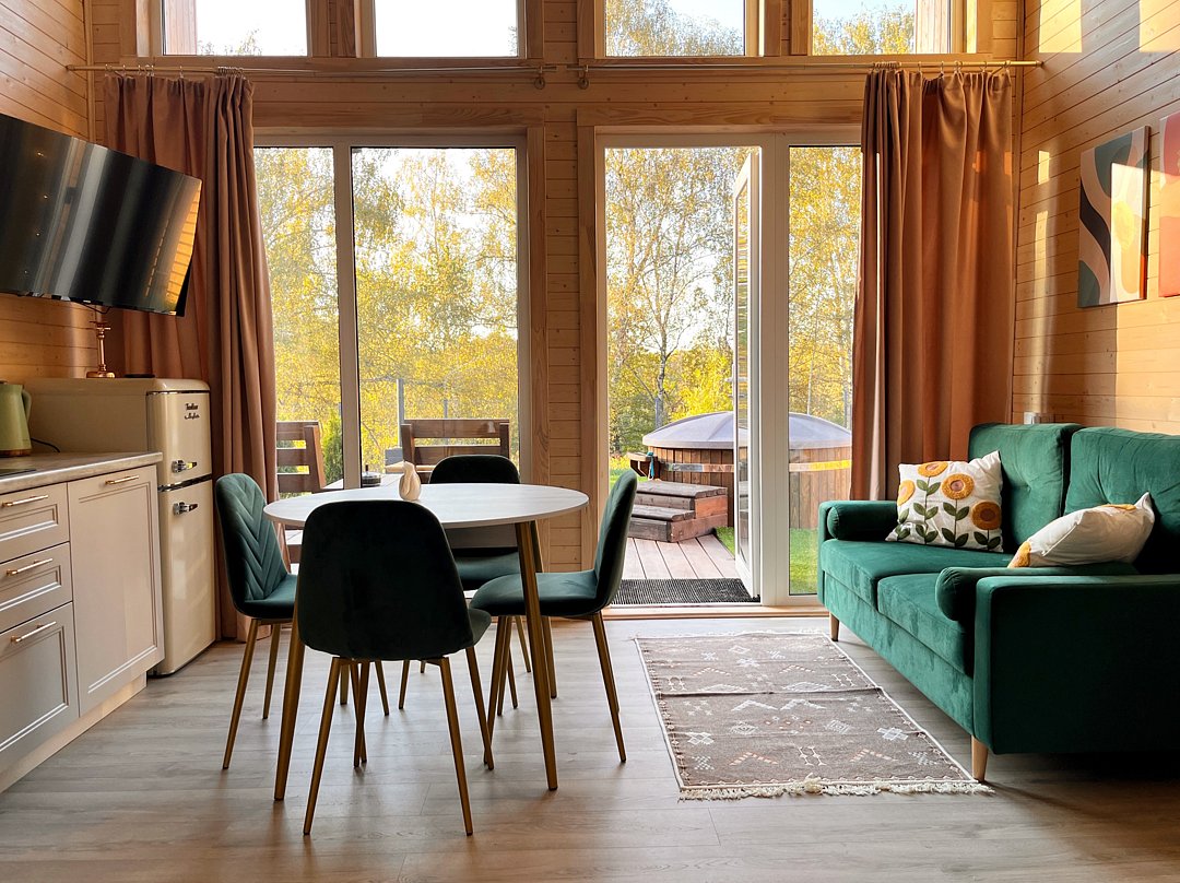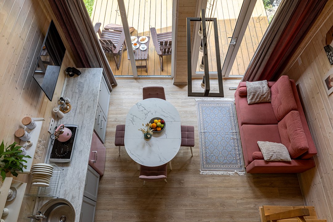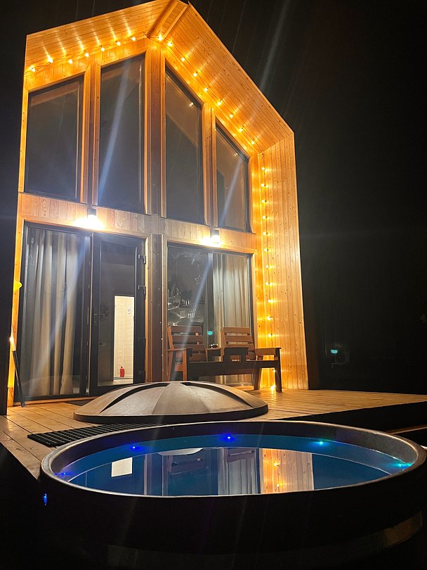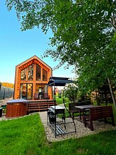 Вас будет ждать один просторный дом с баней, рассчитанный на компанию до 6 человек и четыре комфортабельных дома для 2-4 человек. Все домики оборудованы открытыми террасами с уютными креслами. У каждого есть своя горячая купель и зона для барбекю с уличной мебелью. Из окон открывается восхитительный вид на окружающую природу.