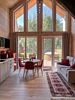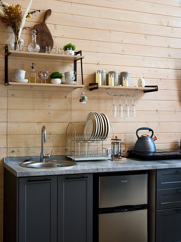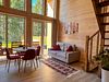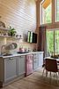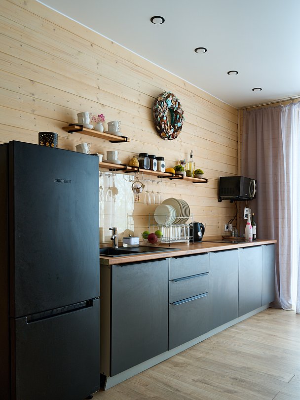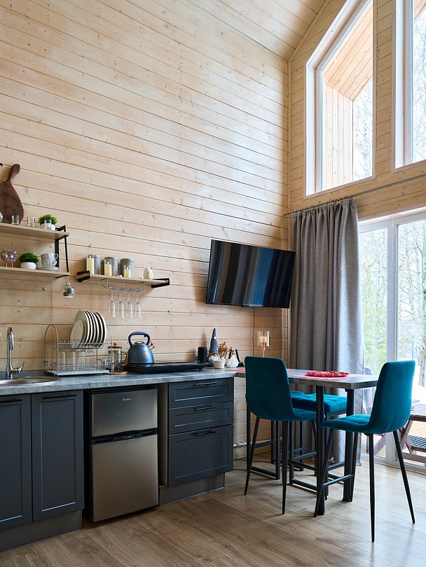 Из больших панорамных окон вид на реку и лес. Полноценная кухня с вместительным холодильником и всем необходимым для приготовления еды. В доме имеется два санузла.