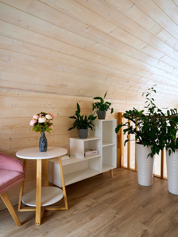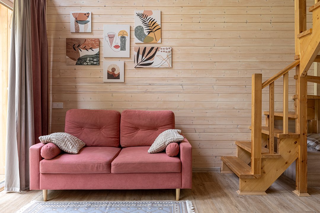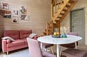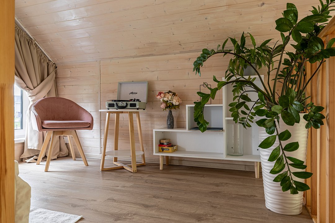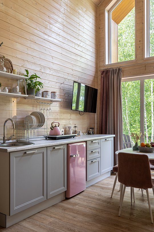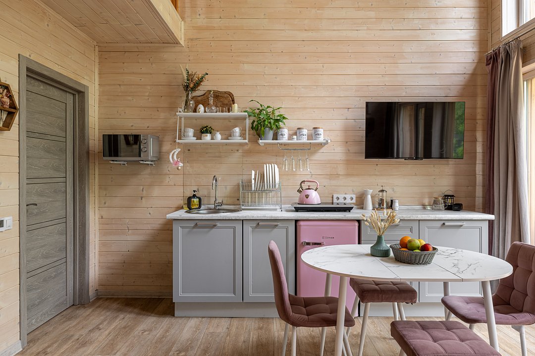 Уютный домик в стиле барнхаус, комфортный для размещения до 4-х человек. Дизайн дома исполнен в розовых тонах. В доме есть все необходимое для комфортного проживания в любое время года.