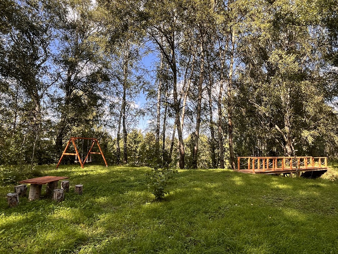 Есть выход к реке с собственным пиросом. Для детей есть игровой комплекс, спортивная площадка и батут. Для всех проживающих стоянка.