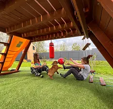 - Разрешено проживание с собаками до 15 кг, а так же с кошками. Обязательное условие — животное воспитано, не портит мебель и приучен к туалету в положенном месте. Выгул собак — за территорией. За питомца взимается дополнительная плата.