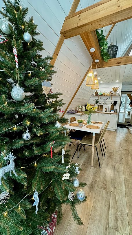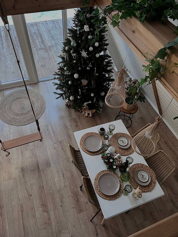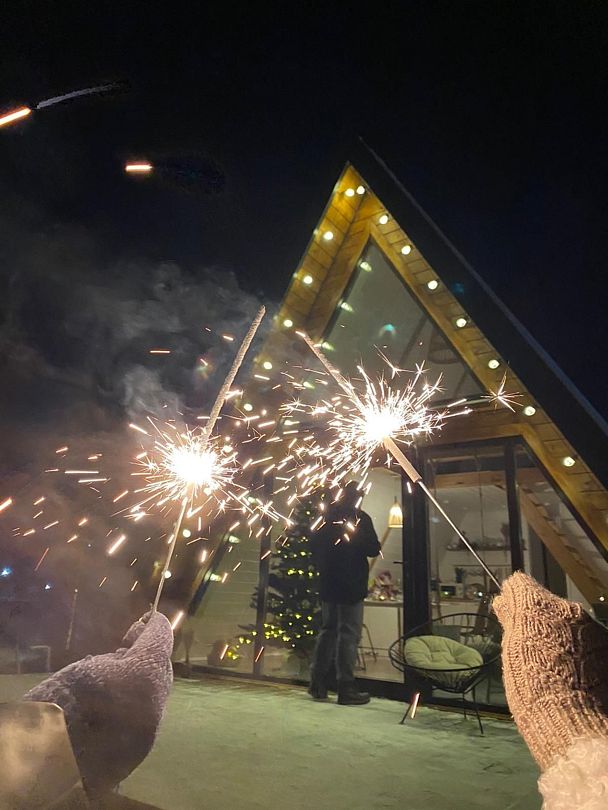 На территории только два домика, между собой огорожены красивым деревянным забором, украшен гирляндой. Вся территория в вашем распоряжении. На террасе подогреваемая круглый год купель и баня бочка с круглым панорамным окном на лес! Для вашего отдыха есть все, с собой только еду и хорошее настроение. Хотя… даже еду не обязательно, можете заказать все из ближайшего ресторана.