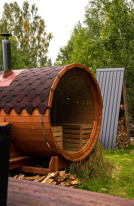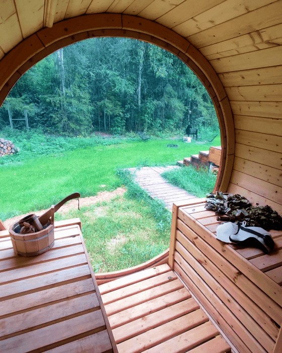 Гости могут погрузиться в атмосферу русской бани, наслаждаясь паром в уникальной бане-бочке с панорамным окном, откуда открывается захватывающий вид на лес. Эта баня на дровах, сохраняющая традиции, работает круглый год и разделена на парную и уютную раздевалку.