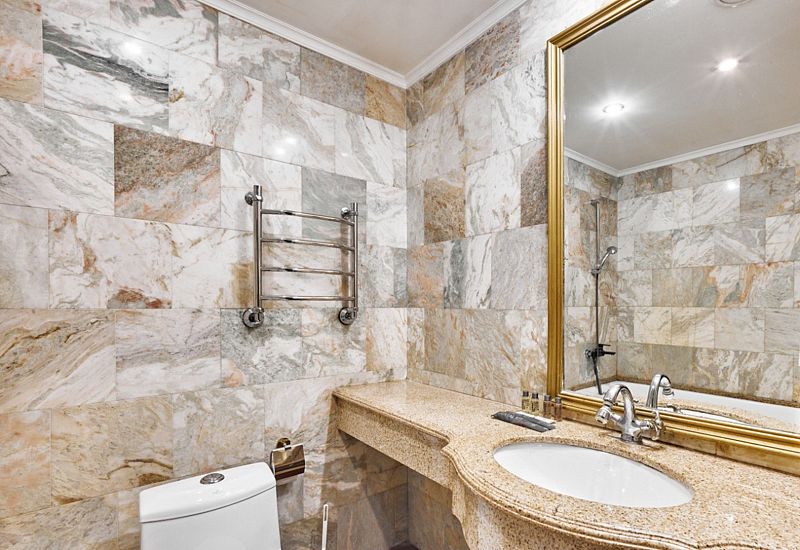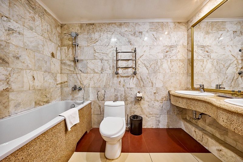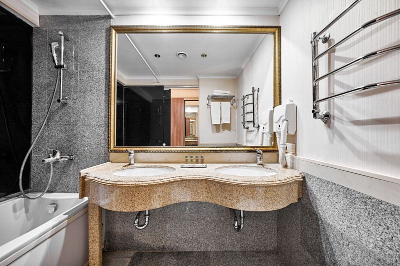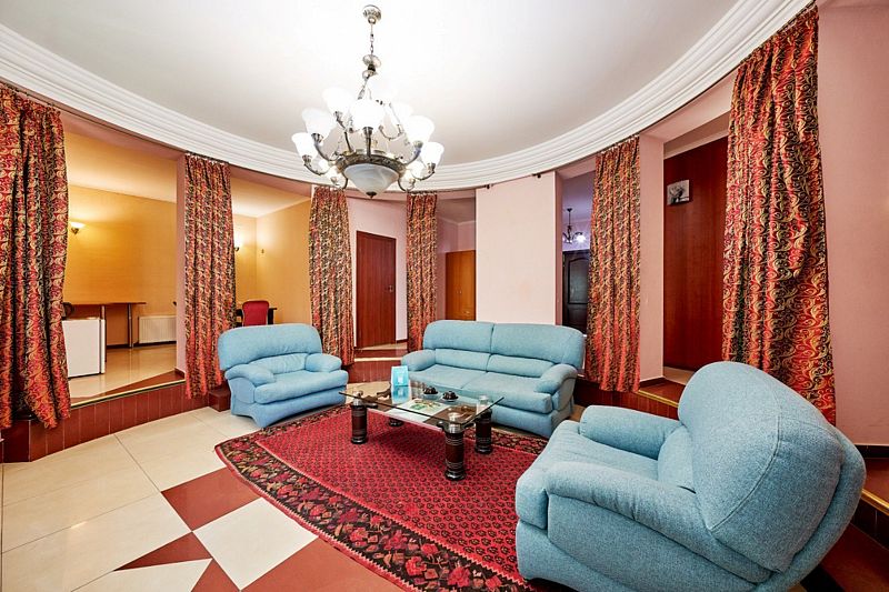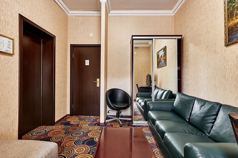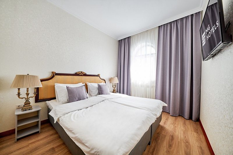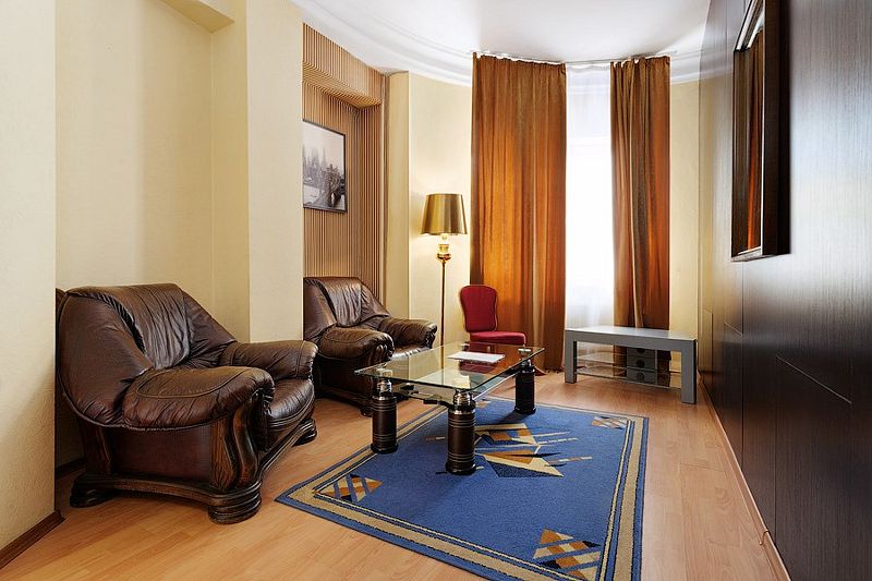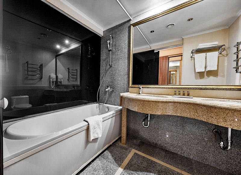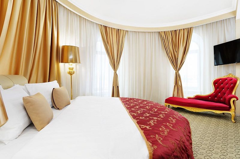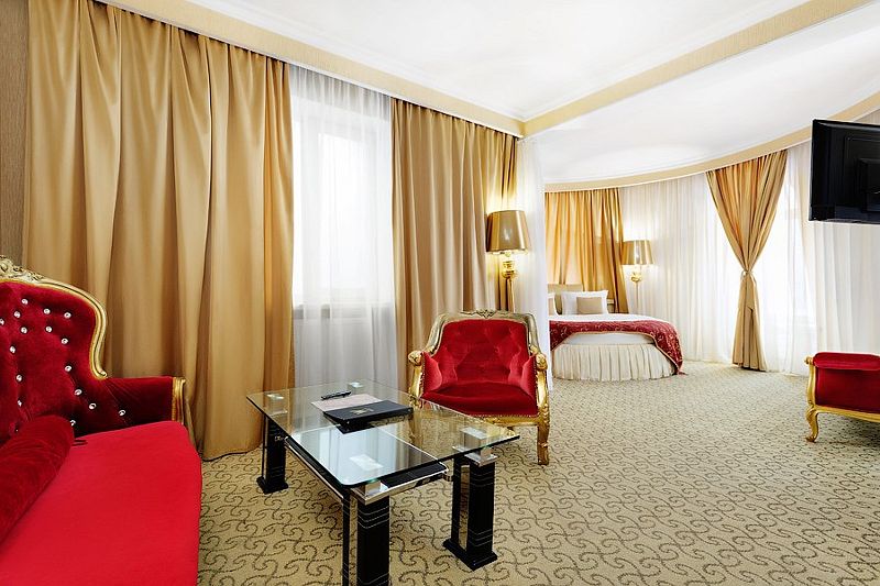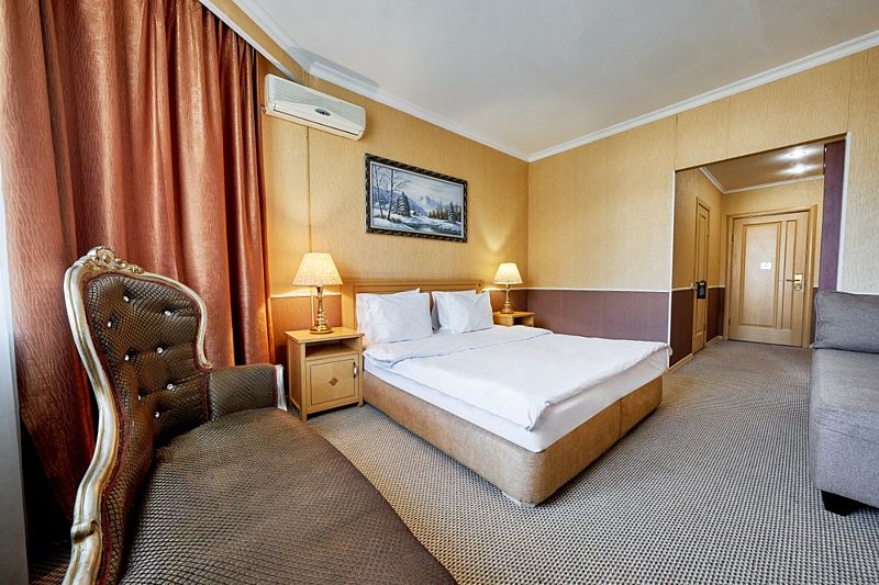 Шикарный номер категории «Люкс» – оптимальный выбор для солидного человека, влюбленной пары, молодоженов. Просторный и комфортный, с тщательно продуманным интерьером — здесь есть все, что может понадобиться вам во время отдыха. Интерьер выдержан в приятной теплой гамме, которая располагает к спокойному отдыху после насыщенного дня. Широкая двухместная кровать размера «King Size» снабжена ортопедическим матрасом, который гарантирует великолепный сон, а современная система климат-контроля обеспечит оптимальную температуру и максимальный уют в номере. В номере есть удобный письменный стол и высокоскоростной Wi-Fi, а также индивидуальный сейф для ценных вещей и документов. Номера укомплектованы мини-баром, чайной станцией, телефоном, феном, гладильными принадлежностями и халатами. Ежедневно при жилой уборке происходит пополнение гигиенических принадлежностей, питьевой воды. Мини-бар не входит в стоимость номера и оплачивается отдельно. Под запрос предоставляются косметический и бритвенный наборы. Окна номера выходят на тихую улицу, внутренний двор и на город, так что можете быть уверены: вашему отдыху не помешает шум.