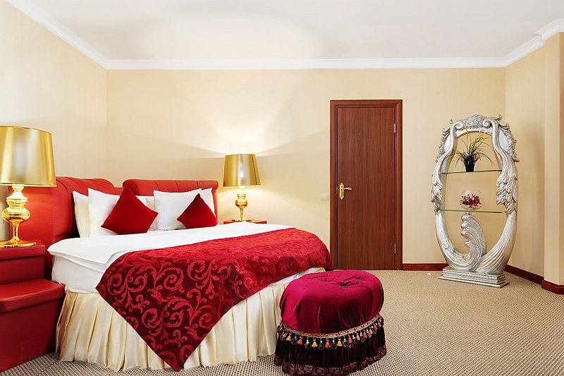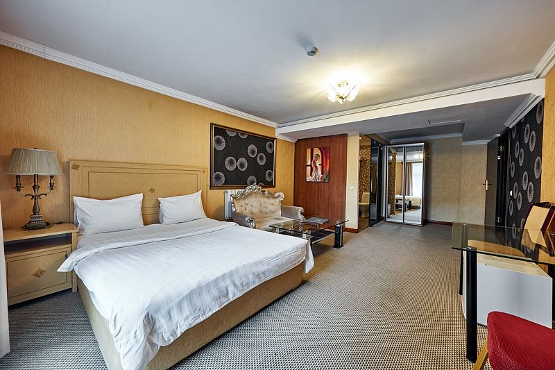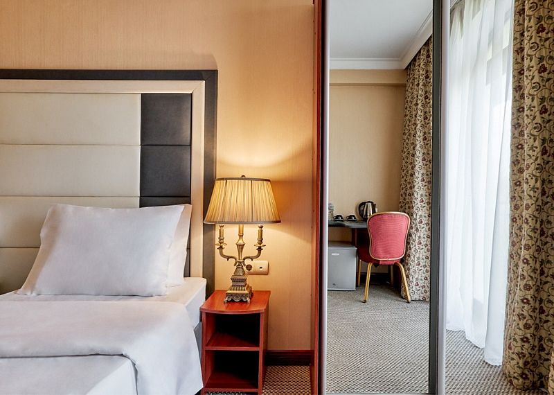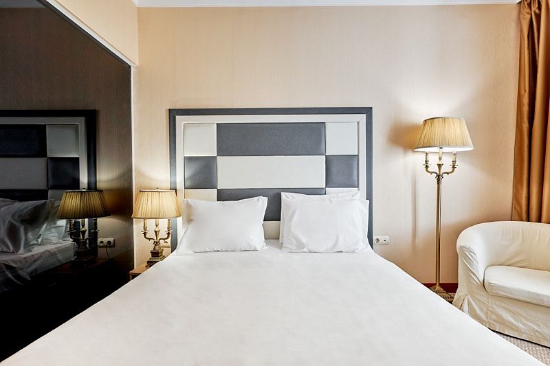 Широкая двухместная кровать размера «King size» с ортопедическим матрацем гарантирует сладкий сон. Ценные вещи и документы можно оставить в сейфе. Номера укомплектованы мини-баром, чайной станцией, телефоном, феном, гладильными принадлежностями и халатами.