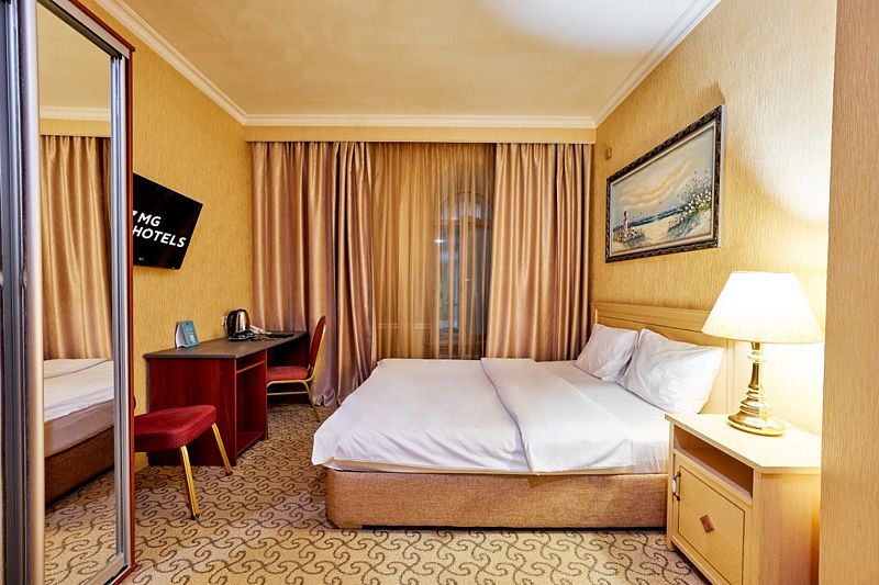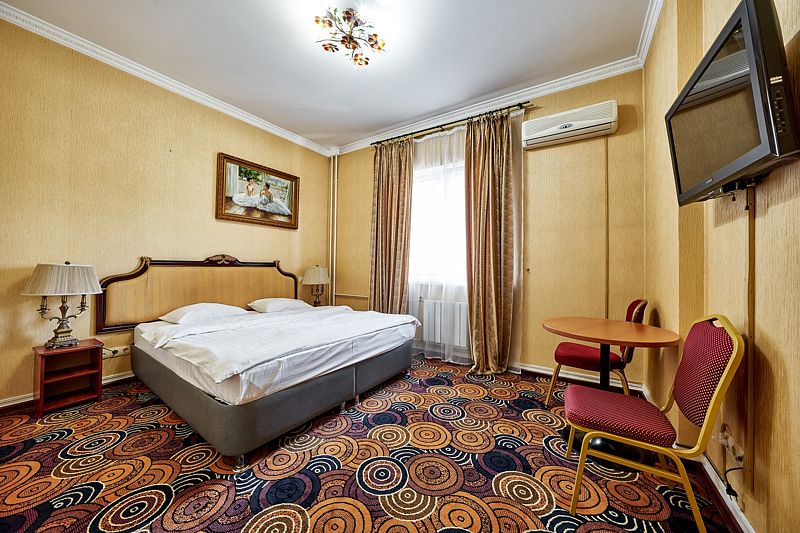 Двухместный номер категории «Стандарт» с одной двуспальной (160см*200см либо 180см*200см) прекрасный вариант для деловой поездки или отдыха пары. Небольшой, но очень комфортный номер отличается стильным интерьером в теплых тонах, которые лишь добавляют уюта, расслабляют и настраивают на отдых. Плазменная панель и доступ к интерактивному спутниковому телевидению разнообразят досуг.