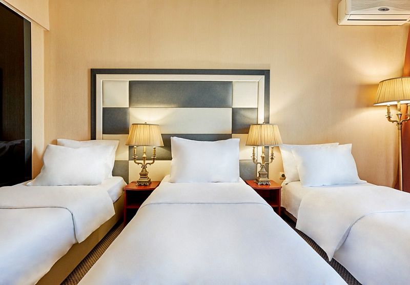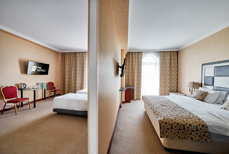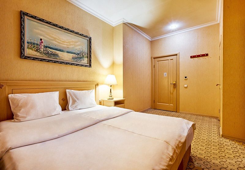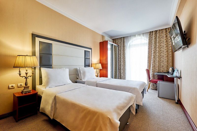 Интерьер выдержан в приятной теплой гамме, которая располагает к спокойному отдыху после насыщенного дня. Две Широкие двухместные кровати размера «King Size» снабжены ортопедическим матрасом, который гарантирует великолепный сон, а современная система климат-контроля обеспечит оптимальную температуру и максимальный уют в номере. В номере есть удобный письменный стол и высокоскоростной Wi-Fi, а также индивидуальный сейф для ценных вещей и документов.