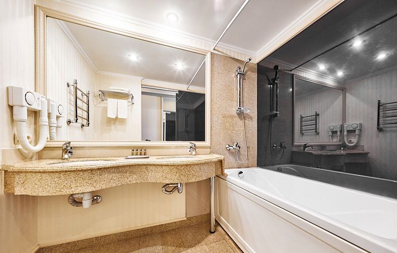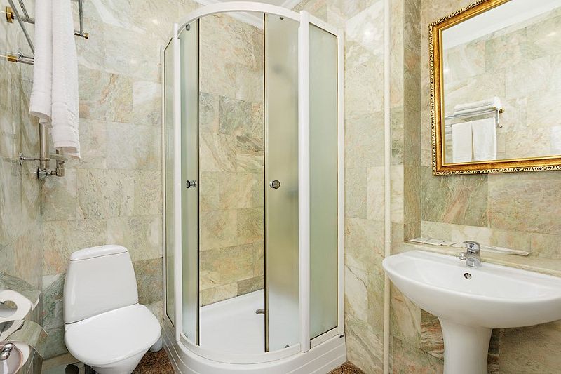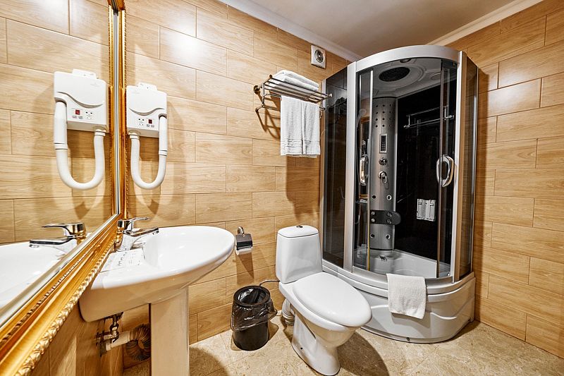 Ванная комната оснащена душевой кабиной. Гостям предоставляются туалетные принадлежности, тапочки и фен, а так же халат (по запросу).